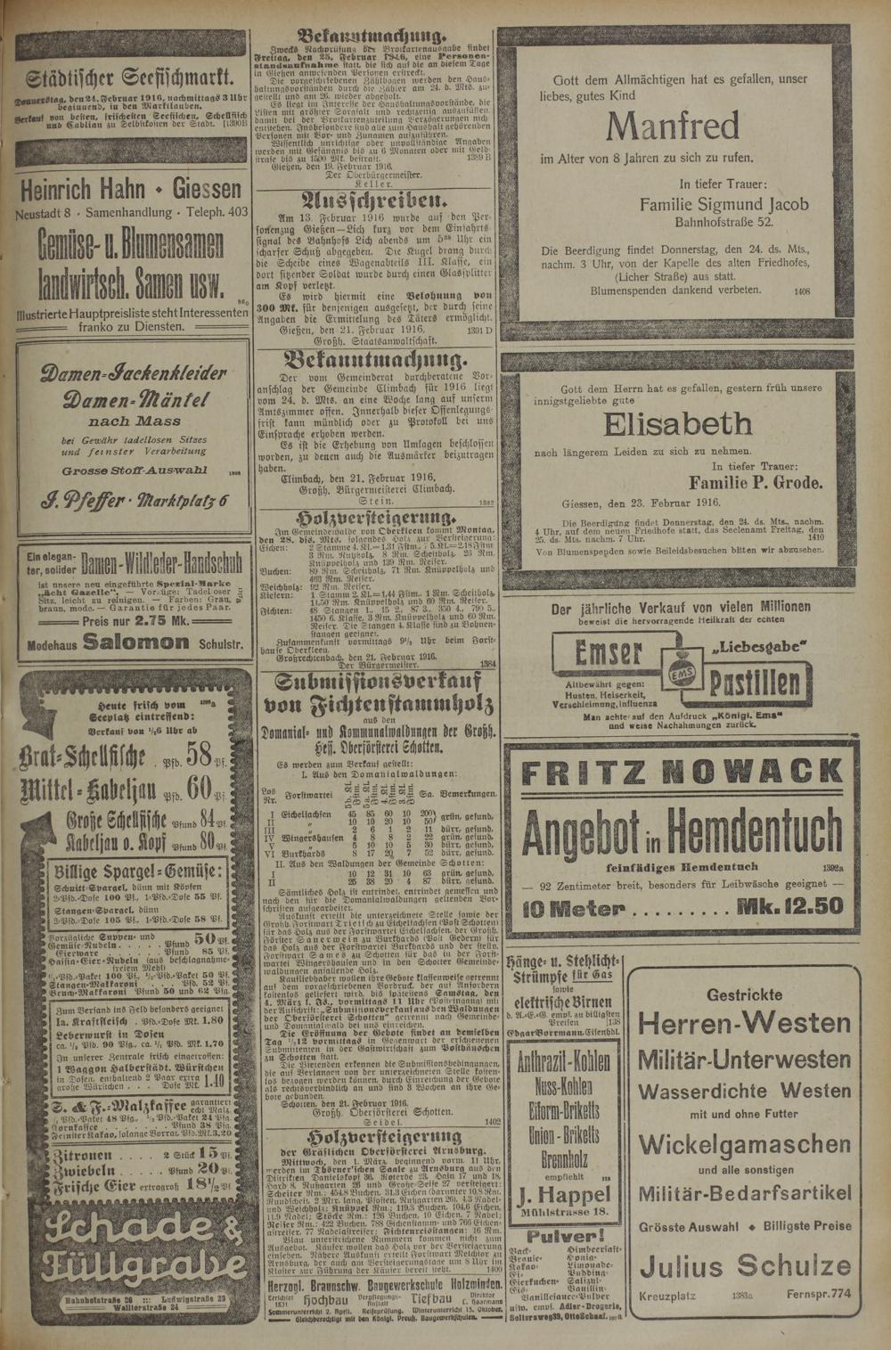 Die Beerdigung findet Donnerstag, den 24. ds. Mts., nachm. 3 Uhr, von der Kapelle des alten Friedhofes, (Licher Straße) aus statt. Blumenspenden dankend verbeten. 1408