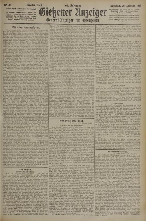 **.Oberhessischer G e s ch i ch t s v e r e i n. Wir »veisen nochmals darauf hin, daß die Mitgliederversammlung Montag, vktz b., Mts., abends 8^/2 Uhr, im Hotel Schütz ftattfinbet. Dre geschäftlichen Verhandlungen werden nur ganz kurze Zeit in Anspruch nehmen und sind ebenso öffentlich wie der im Anzeigen- terl angekündigtc Vortrag.