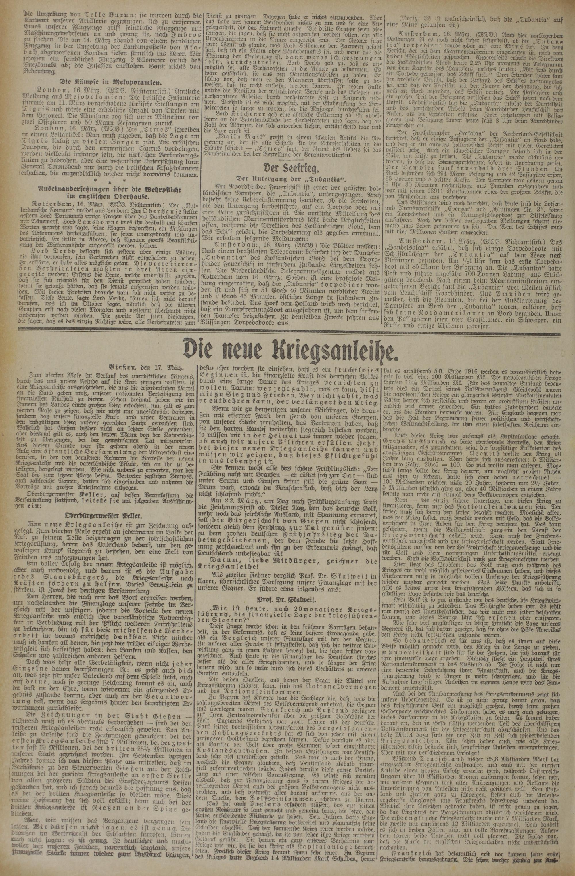 Am 2 2. März, am Tag rrach Frühlingsanfang, läuft dre Zerchnungsfrist ab. Dieser Dag, den das deutsche Volk, mehr noch das feirMiche Ausland, mit Spcnrnung erwartet, soll die Bürgerschaft von Gießen nicht schlafend, sondern gleitt) dem Frühling, zur Tat gerüstet finden: zu dem großen deutschen Frühjahrs sieg der Daheimgebliebenen, der dem Feinde die letzte Hoffnung zerschmettert und ihn M der Erkennttris zwingt, daß Deutschlano unbesiegbar ist!