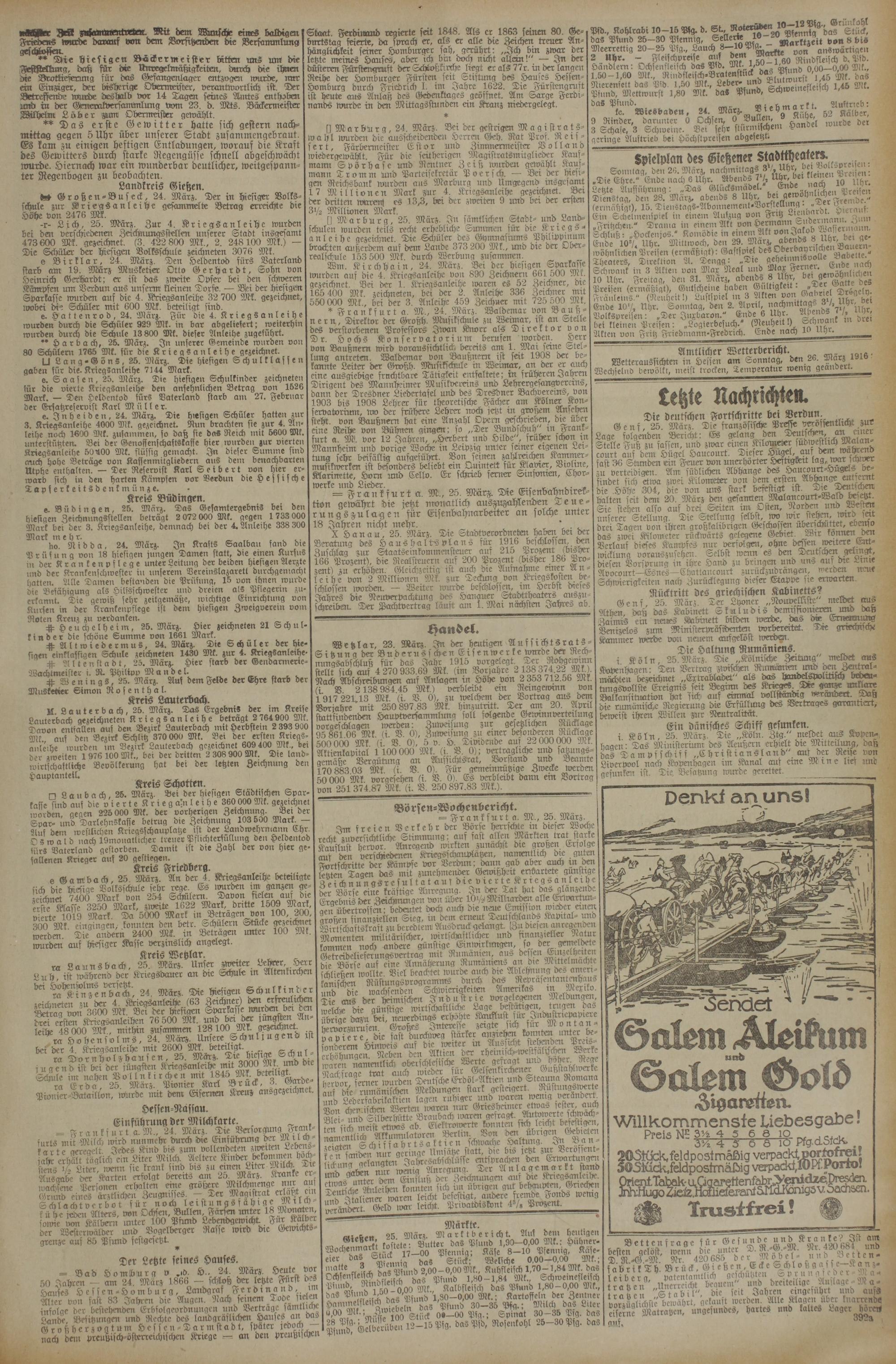 [] Marburg, 25. Mürz. In sämtlichen Stadt- und Landschulen wurden teils recht erhebliche Summen für die Kriegsanleihe gezeichnet. Die Schüler des Gymnasiums Philippinum brachten außerdem aus dem Lande 373 200 Mk., und die der Oberrealschule 153 500 Mk. durch Werbung zusammen.