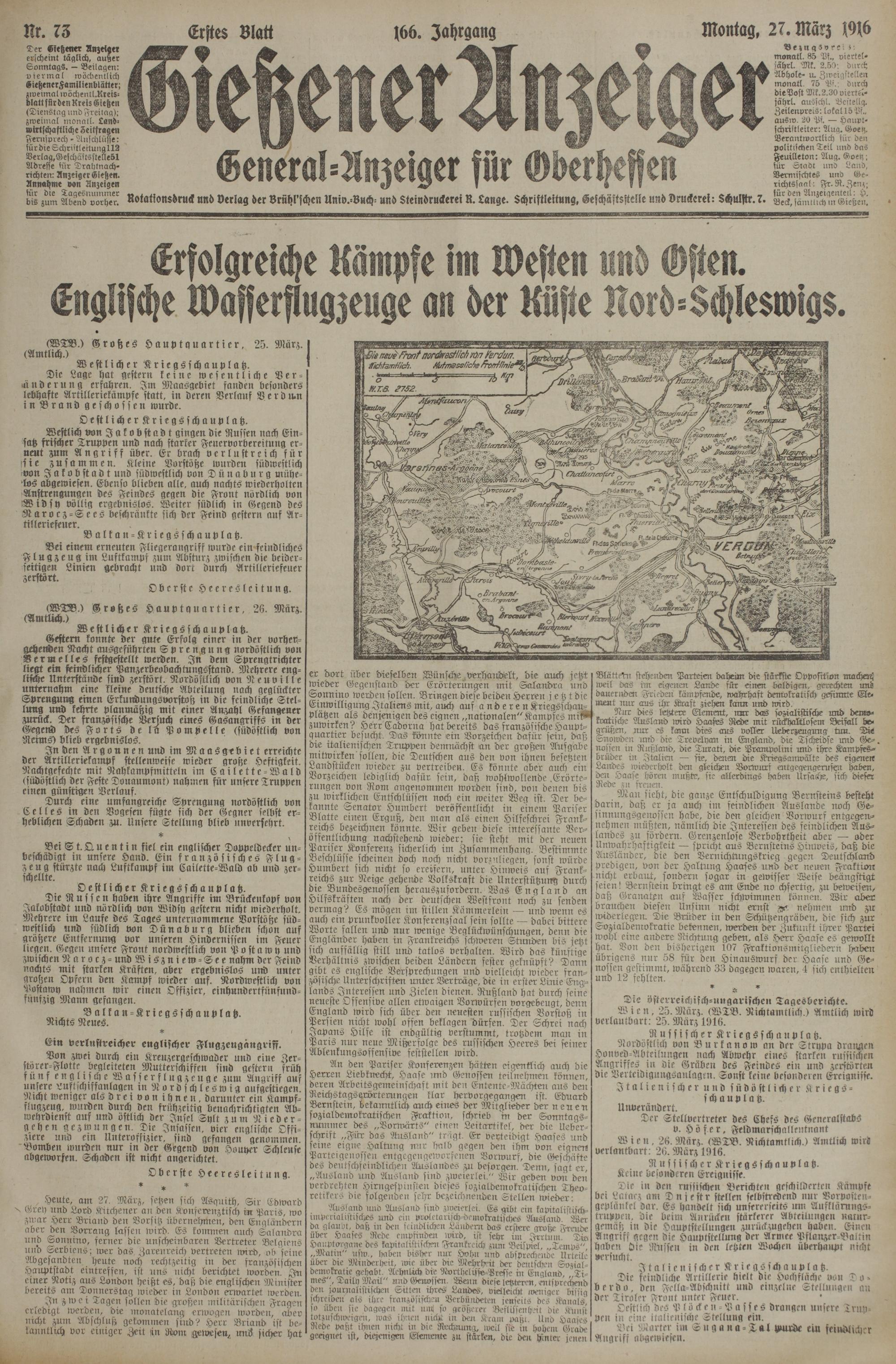 Die Lage hat gestern keine wesentliche Ver- stinderung erfahren. Im Maasgebiet fanden besonders lebhafte Artilleriekämpfe statt, in deren Verlauf V e r d u.n in Brand geschossen wurde.