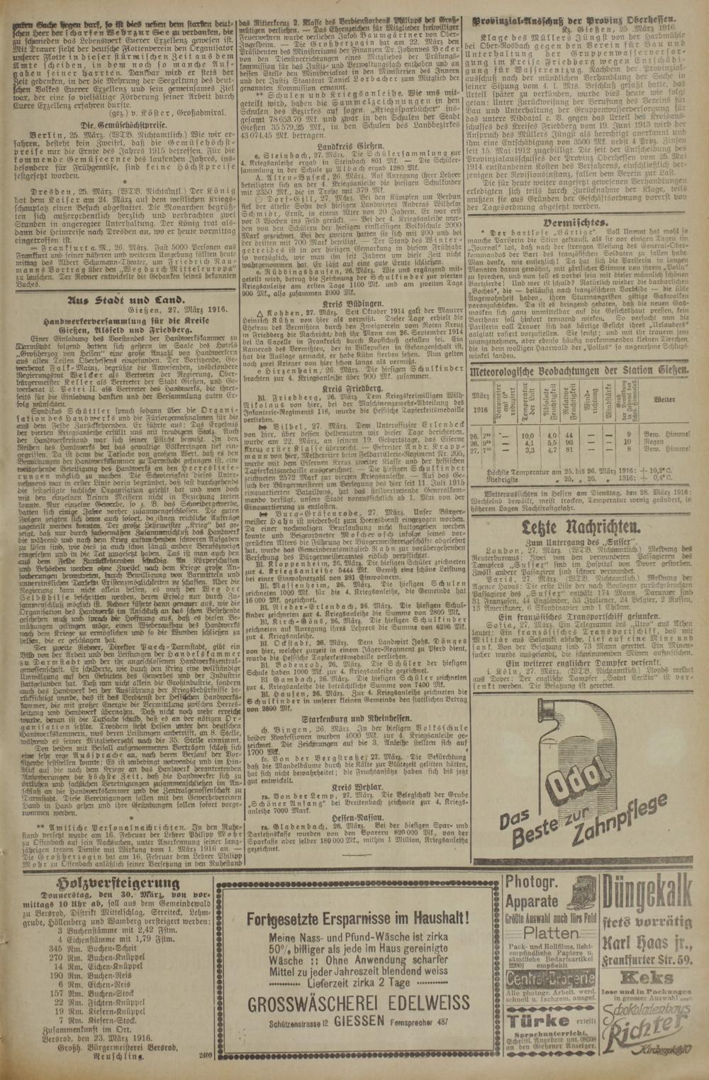 Wetteraussichten in Hessen am Dienstag, den 28. März 1916: Wechselnd bewölkt, meist trocken, Temperatttr wenig geändert, in höheren Lagen Nachtfrostgefahr. _