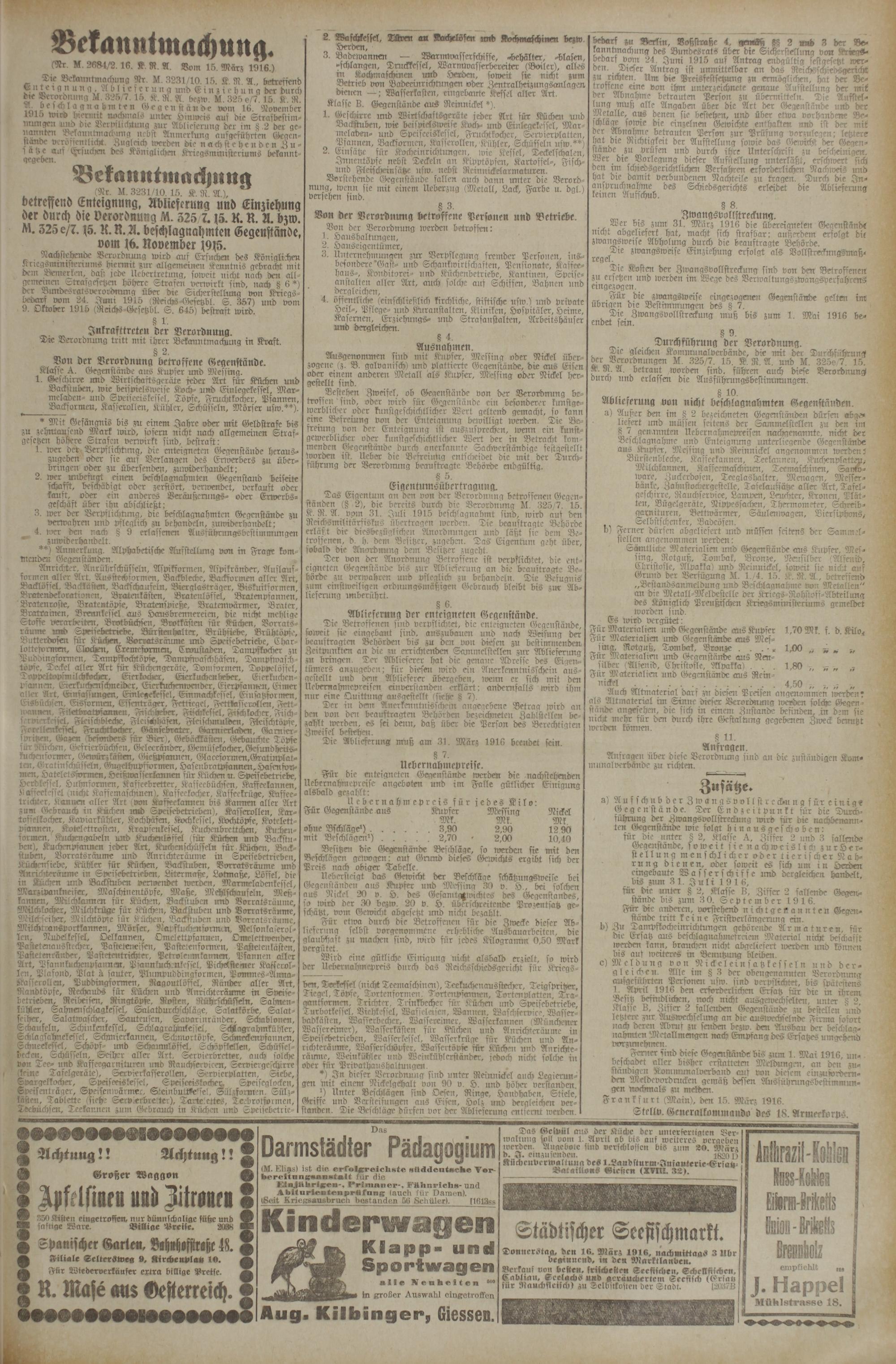 Ferirer sind diese Gegenstände! bis zrrm 1. Mai 1916, unbeschadet aller bisher erstatteten Meldungen, an den zuständigen Konnnunalverband auf von diesem cinfordern- tum Mel de vord rucken gemäß dffsen dlusführnngsbffttmmun- gen Nocknnals zu melden.