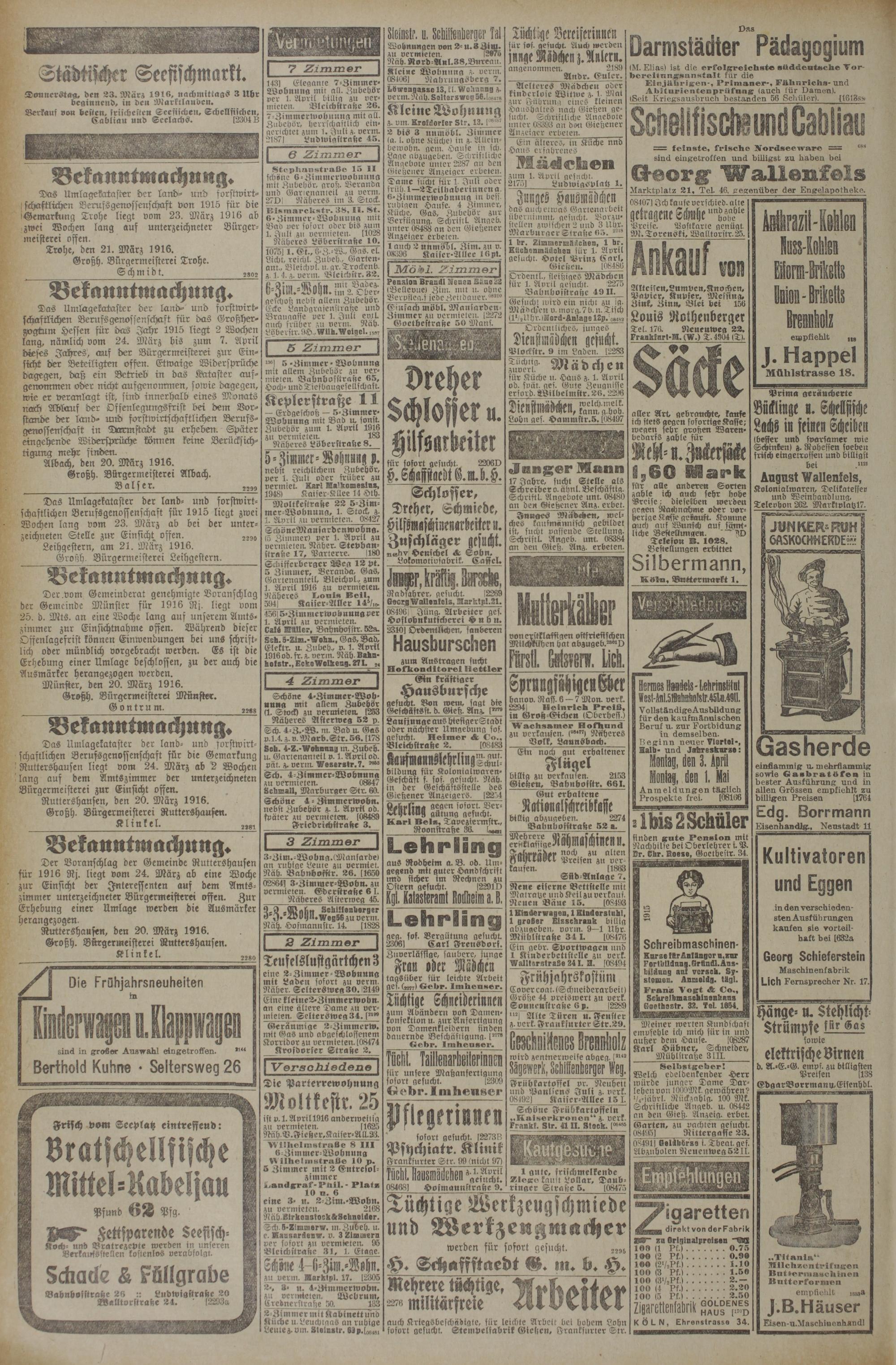 Donnerstag, den 23. März 1916, nachmittags 3 Uhr beginnend, in den Marktlauden.