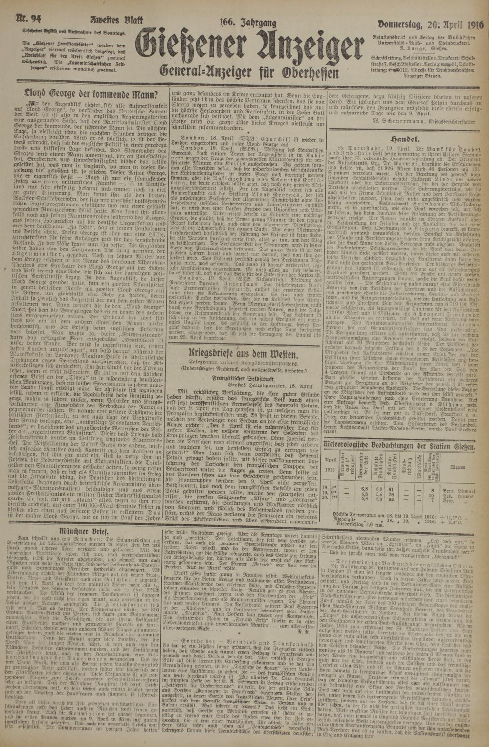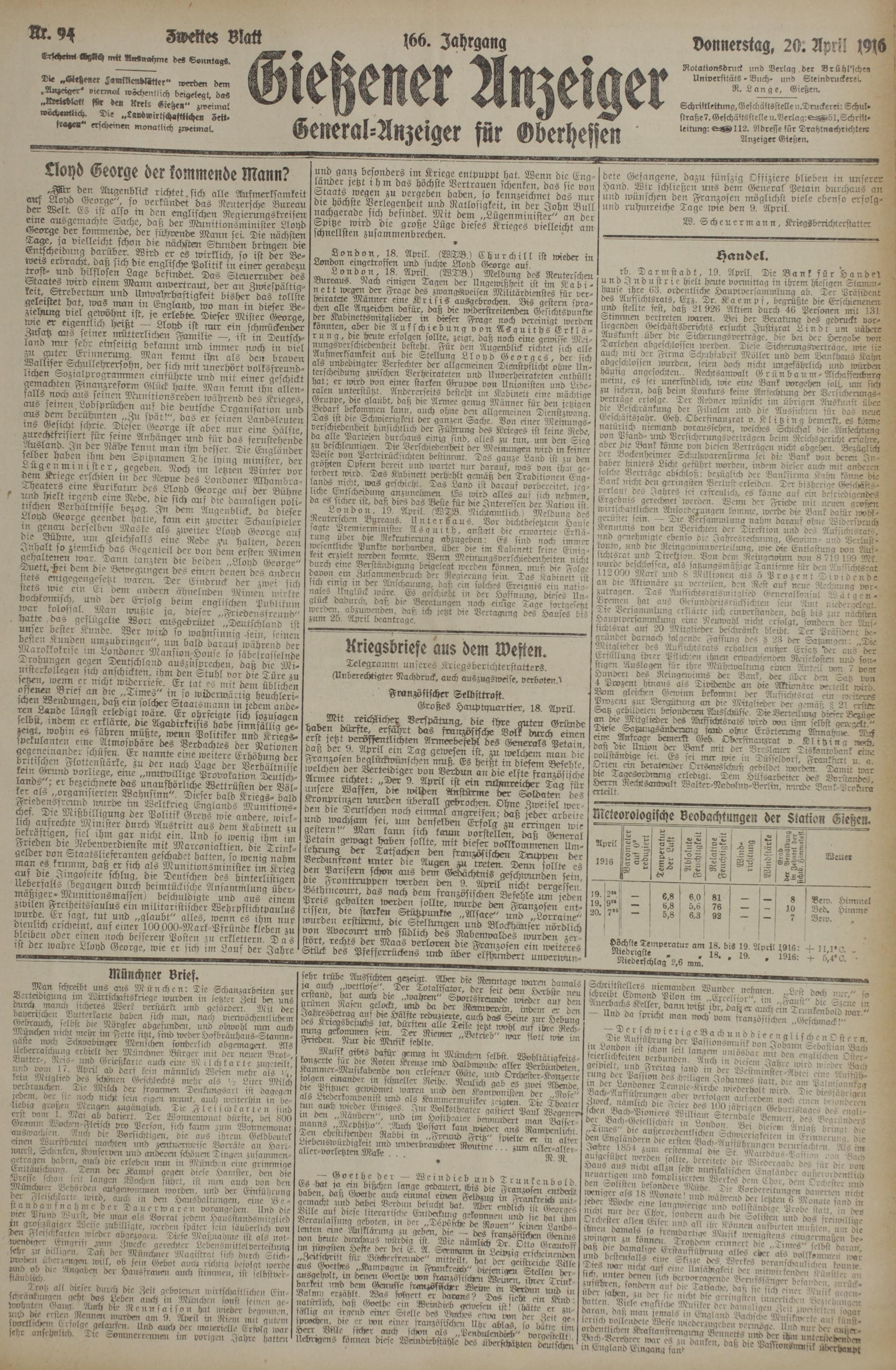 “ m il- bi« J9. April 1916: + n.l-O. . ' Niederschlag'?,6 mm' ' ' ' "l«. +