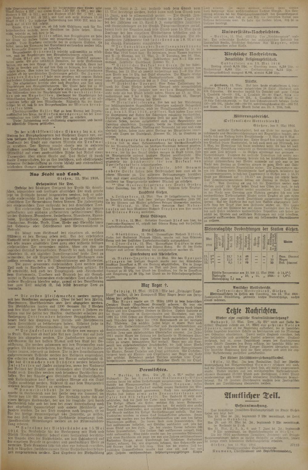 Oeffentlicher Wetterdienst, Gießen. Wetteraussichten in Hessen am Samstag, den 13. Mai 1916; Zunehmende Bewölkung, zeitweise leichte Niederschläge, nachts etwas wärmer.