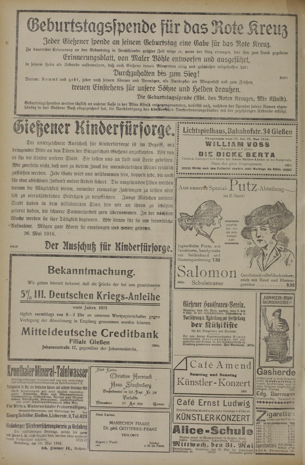 Der Unterzeichnete Ausschuß für Kinderfürsorge ist im Begriff, mit dringender Bitte an den Türen der Bürgerschaft Gießens anzuklopfen. Wir tun es für die Kinder unserer Stadt. Sic sollen uns an Leib und Seele gedeihen. Wir zweifeln nicht, daß uns zu diesem Zweck die unentbehrlichen Mittel reichlich zufließen werden. Jede Gabe wird uns willkommen sein, doppelt jede, die auch für eine absehbare Zukunft unsere Arbeit sichert. Die umgehenden Listen werden darum die Möglichkeit bieten, entweder einmalige Zahlungen zu leisten oder sich zu vierteljährlichen Beiträgen zu verpflichten. Junge Mädchen unserer Lradt haben in dem hilfsbereiten Sinn, den wir an ihnen zu schätzen gelernt haben, die schwere Sammelarbeit gen: übernommen. In der nächsten Woche werden sie ihre Tätigkeit beginnen. Wir bitten für sie um freundliche Aufnahme. Mögen gute Worte sie enipfangen und weiter geleiten W. Mai 1916.