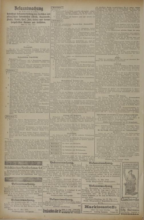 „Am 31. Mai 1916 ist eine Bekanntmachung des stellvertretenden Generalkommandos des XVIII. Armeekorps betreffend: Bestands erhebung von tierisch en und pflanzlichen Spinnstoffen (Wolle, B a u vt w 0 l l e, Flachs, Ramie, Hanf, Jute, Seide) und daraus h e r gestellten Garnen und Seilfäden erlassen worden. Tie Bekanntmachung betrifft: Meldepflicht, meldepflichttge Gegenstände. tncldepflichtige Personen usw., Stichtag und Meldefrist, Meldescheine, Muster, Lagerbuch, Anfragen und Anträge, sowie Inkrafttreten und älterer Bekanntmachungen. Ter Wortlaut der'Betanntmachnng ist auf unserer Amtsstube einzusehen."