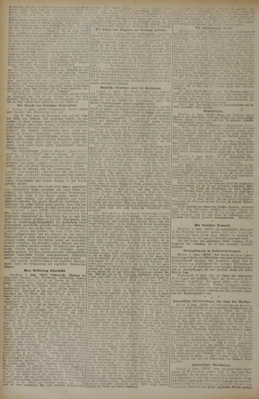 „Am 31 Mai fand ein Seegefecht statt ans der der Küste von Jütland. Die englischen Schiffe, die am meisten im Feuer standen, waren die Schlachtkveuzerflotte, einige .Kreuzer und leichte Kreuzer, die durch vier schnelle 'SMachsichiffe unterstützt wunden. Die Verluste waren ffchwer. 'Die deutsche Schlachtflotte hatte, durch dos