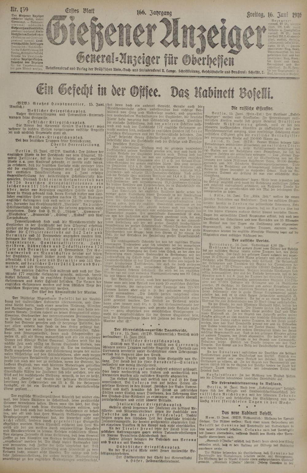 Berlin, 15. Juni. (WTB. Amtlich.) Der Führer der englischen Flotte in der Seeschlacht vor dem Skagerak, Admiral Jell.icoe, hat in seinem Befehl an die englische Flotte u. a. zum Ausdruck gebracht, er zweifle nicht daran, M erfahren, daß die deutschen Verluste nicht geringer seien als die englischen. Demgegenüber wird auf die bereits in der anttlichen Veröffentlichung am 7. Juni erfolgte Gegenüberstellung der beiderseitigen Schiffsverluste hingewiesen. Hiernach st e h t einem Gesa m t v e r l u st von 60 72 0 deutschen Kriegs schiffston neu ein solcher von 117 150 englische «Tonnen gegenüber. wobei nur diejenigen englischen Schiffe und Zerstörer m Ansatz gebracht sind, deren Verlust bisher von amtlicher englischer Sette zugegeben worden ist. Narb Aussagen englischer Gefangener sind noch weitere Schisse nntergegan- gen darunter das Großkampfschiff „WarspiteAn deutschen Schrsssverlusten sind andere als die bekannt gegebenen nicht emgelrelen. Diese sind S.M.S. „Lützow", „Pommern", „Wiesbaden", „Frauenlob", „Elbing", „Rostock" und fünf Torpedoboote.