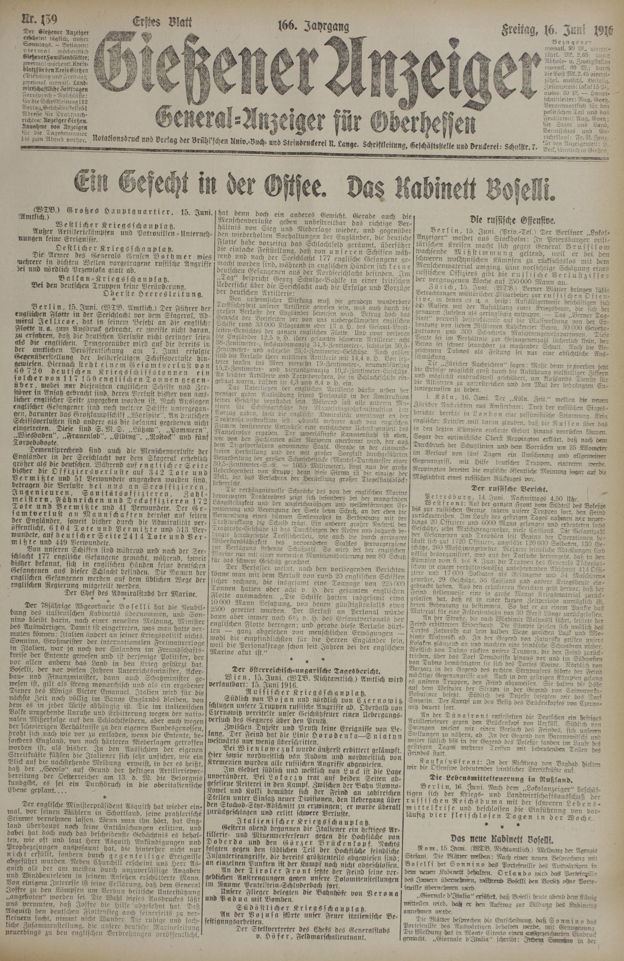 B et q s r) c - nwnatl. 90 03r. f viertel- fährt. Mk. 2.65 diirch Abhole- m Zweigstellrn monatl. 69 Vf.: durch die Post Mt. 2.45 viertel« jü'hrl. ausschl. Bestellg. Zeilenpreis: lokal 15 Pf., ausro. 20 Pf. — Haiipt- schriitleiter: Aug. Goetz. Verantwortlich für den politischen Teil und das Feuilleton: Aug. Goetz; für Stadt irnd Land, Vermischtes und Gerichtssaal: Fr. N. Zen;: lür den Anzeigenteil: p’ Beck, sämtlich m Gießen
