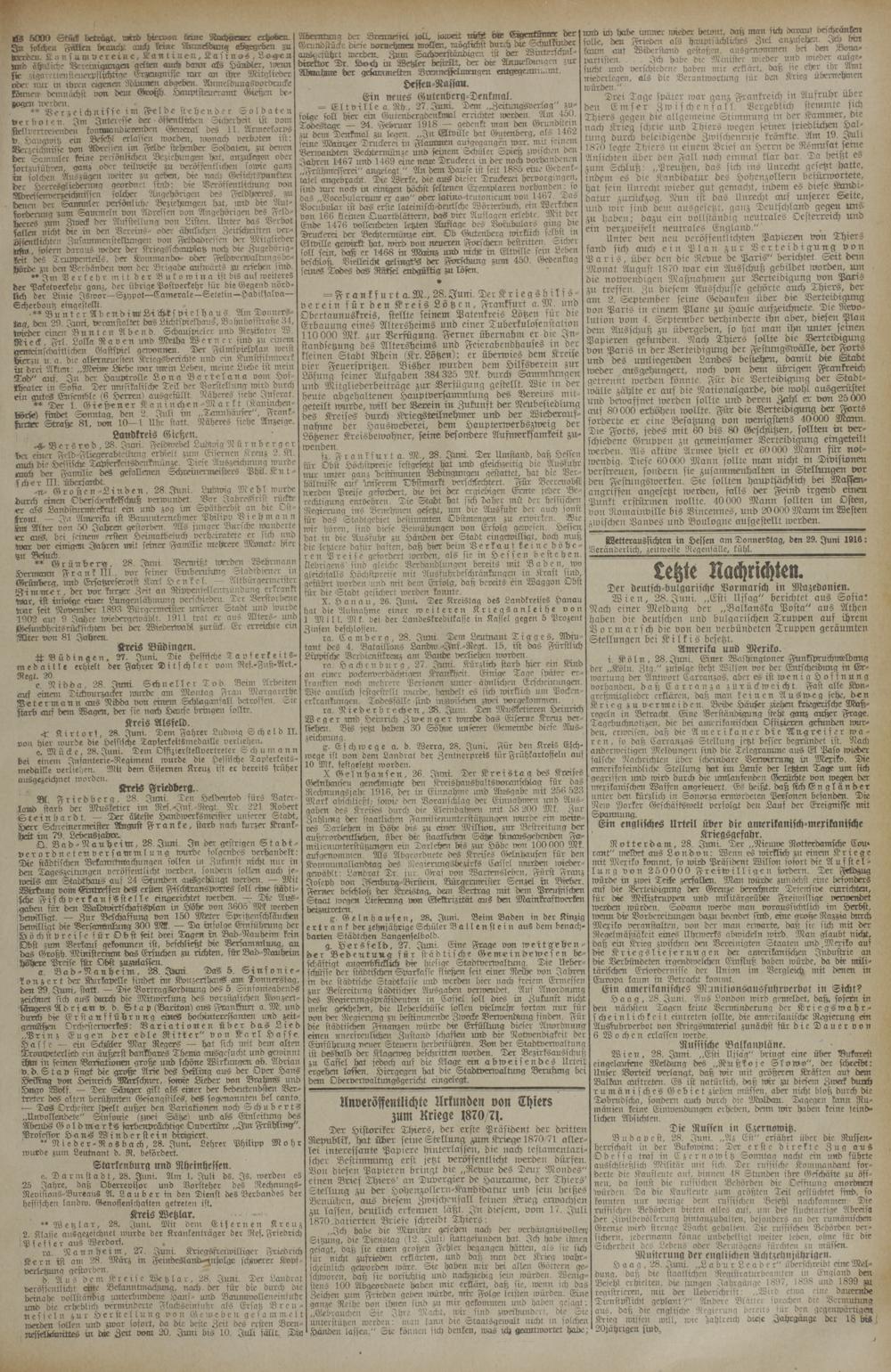 Bl Fricdberg, 28. Juni. Ten Heldentod fürs Vater laud starb der Musketier im Res.-Jnf.-Regt. Nr. 221 Robert Steinhardt. — Der älteste Handwerksmeister unserer Stadt, Herr Sch reiner meister August Franke, starb nach kurzer Krank hat im 79. Lebensjahve.
