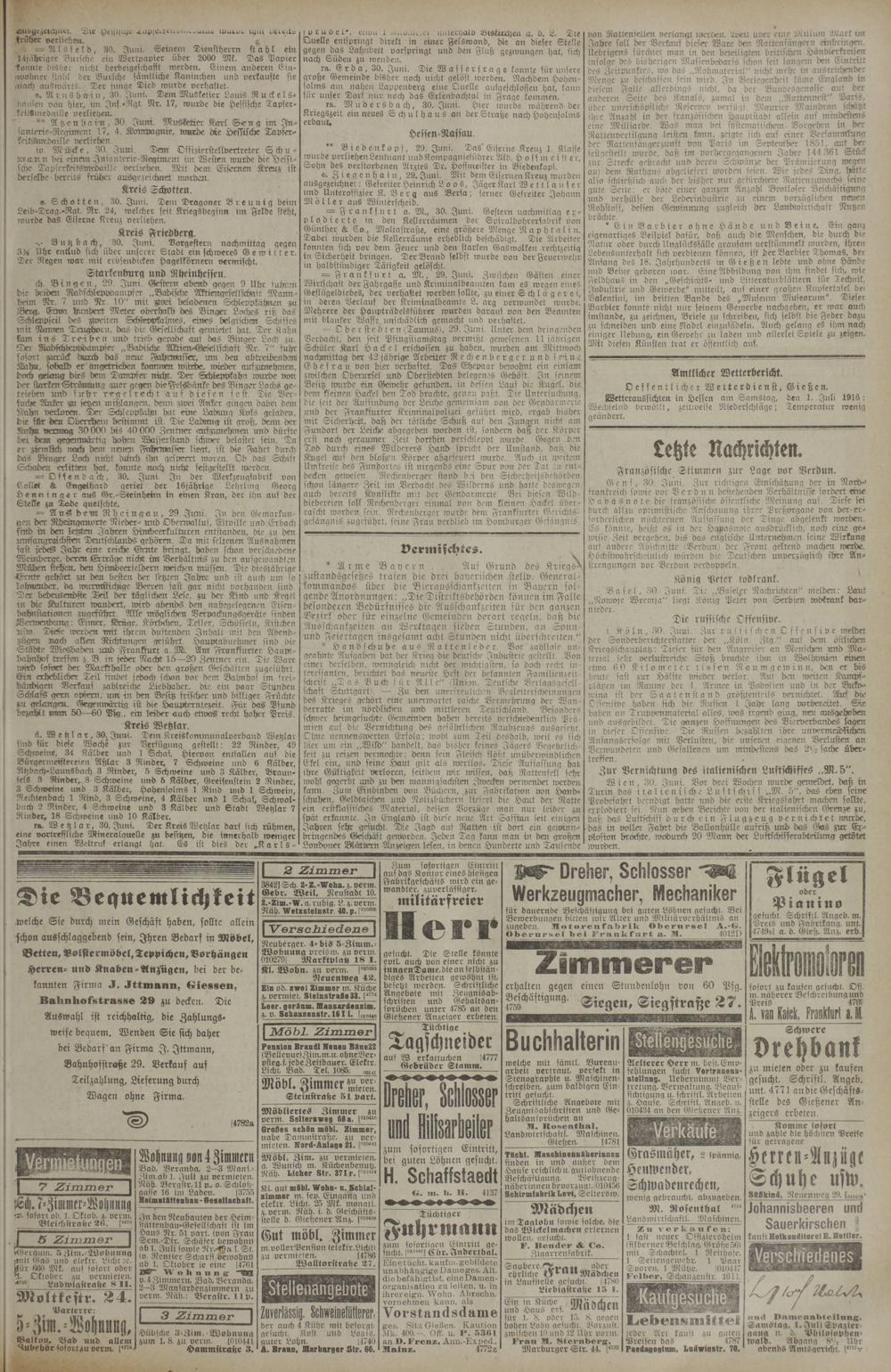 Oeffentlichcr Wetterdien st, Gießen. Wetteraussichten in Hessen am Samstag, den 1. Jttli 1916 : Wechselnd bewölkt, zeitweise Niederschläge; Temperatur wenig geändert.