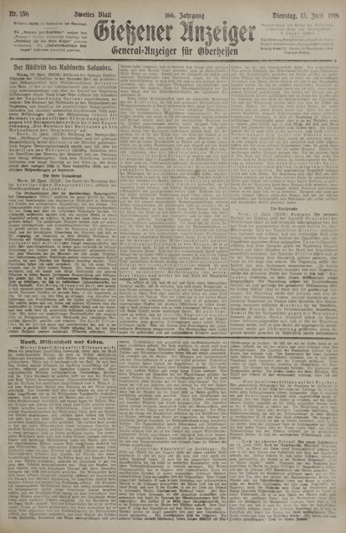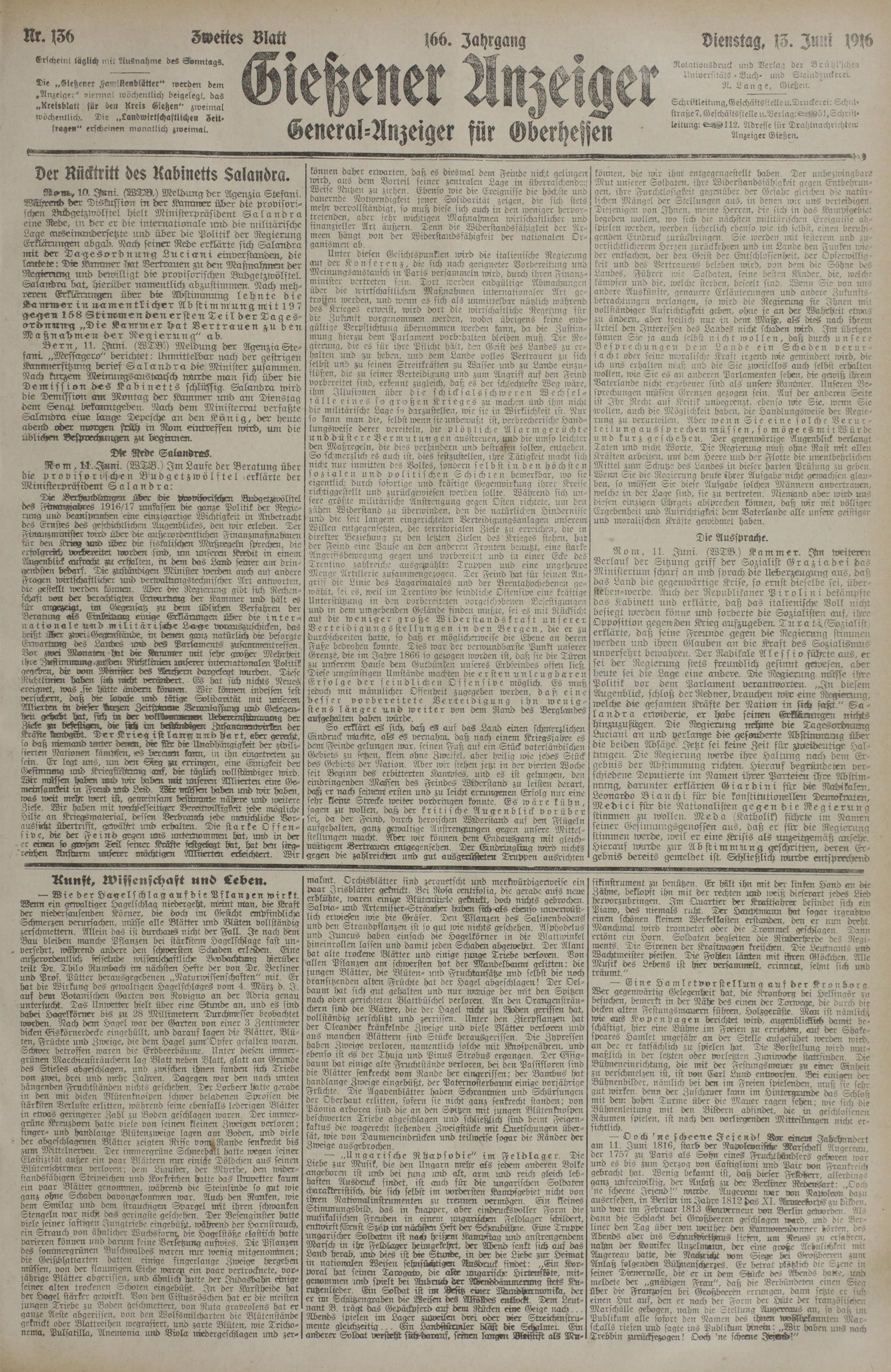 Bern, 11. Juni. (WTB'H Meldung der AgenziaStefan:. „Messagero" berichtet: Unmittelbar nach der gestrigen Karmnersitznng berief Salandra die Minister zusammen. Nach krwzem MeinurrgsmrstiLusch wurde man sich über die Demission des Kabinetts schlüssig. Salandra wird die Demission am Montag der Kammer und am Dienstag dem Senat bekanntgeden. 9Lach dem Ministerrat verfaßte Salandra eine lange Depesche an den König, der heute abend oder morgen früh in Rom eintveffen wird, um die üblichen Bespvechurlgen zu beginnen.
