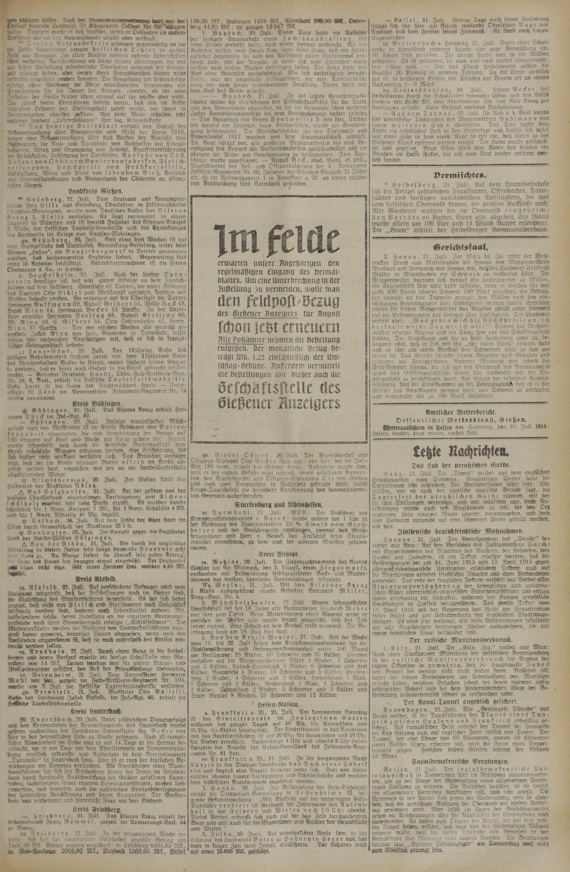 Wa. Wetzlar, 21. Juli. Mit dein Eisernen K r e n z 2. Klasse ausgezeichnet wurde Gefreiter Bernhard M n l l e r, Drag.-Regt. Nr. 4.