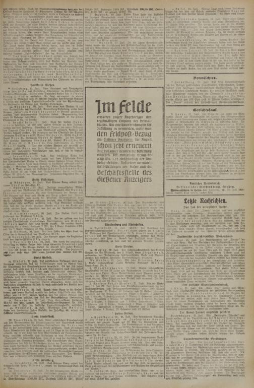 # Vonhausen. 20. Juli. Im Kampfe gegen die Engländer starb der Garde-Füsilier H ö l z i n g e r.