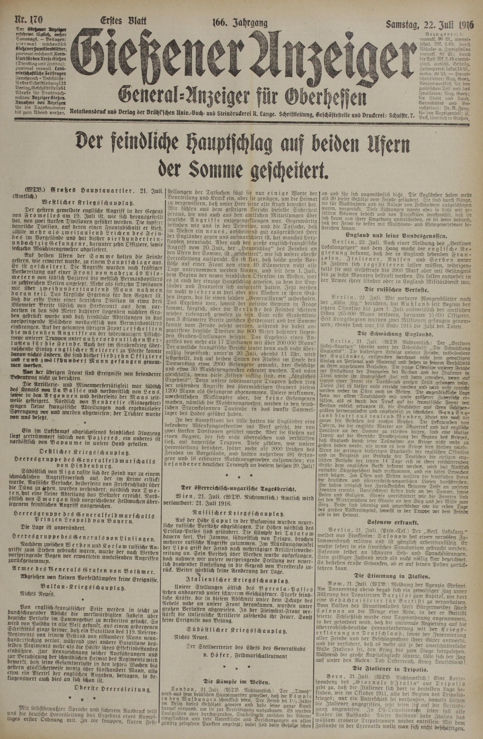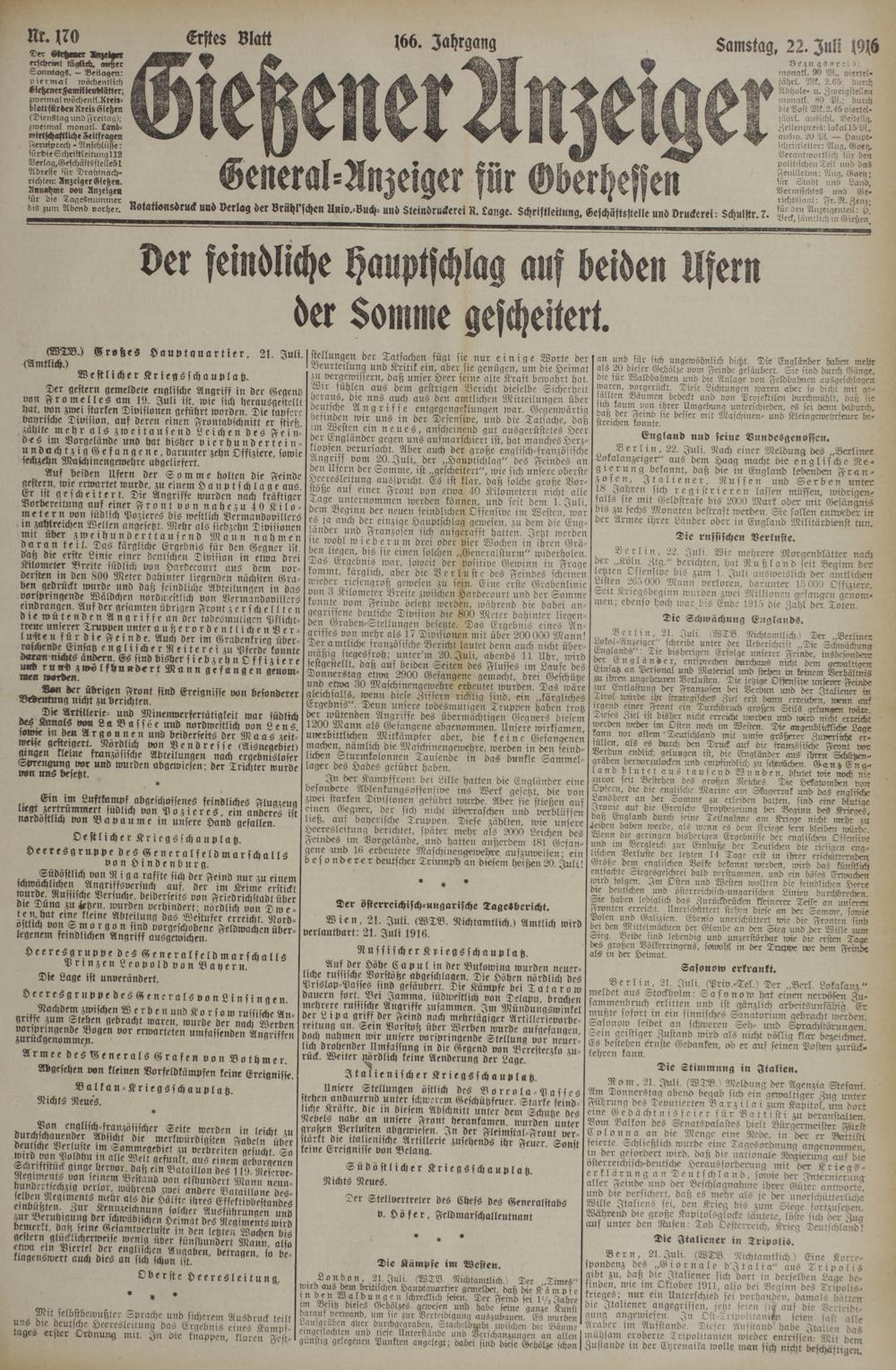 In der Kampffront bei Lille hatten die Engländer eine besondere Ablenkungsoffensioe ins Werk gesetzt, die von zwer starken Divisionen geführt wurde. Aber sie stießen au' einen Gegrrer, der sich nicht überraschen und verblüffen ließ, auf bayerische Truppen. Diese zählten, wie unsere Heeresleitung berichtet, später nrehr als 2000 Leichen des Feindes im Vorgelände,.und hatten außerdem 181 Gefangene und 16 erbeutete Maschinengewehre aufzuweisen; ein b esonderer deutscher Triinnph an diesem heißen20.Juli!