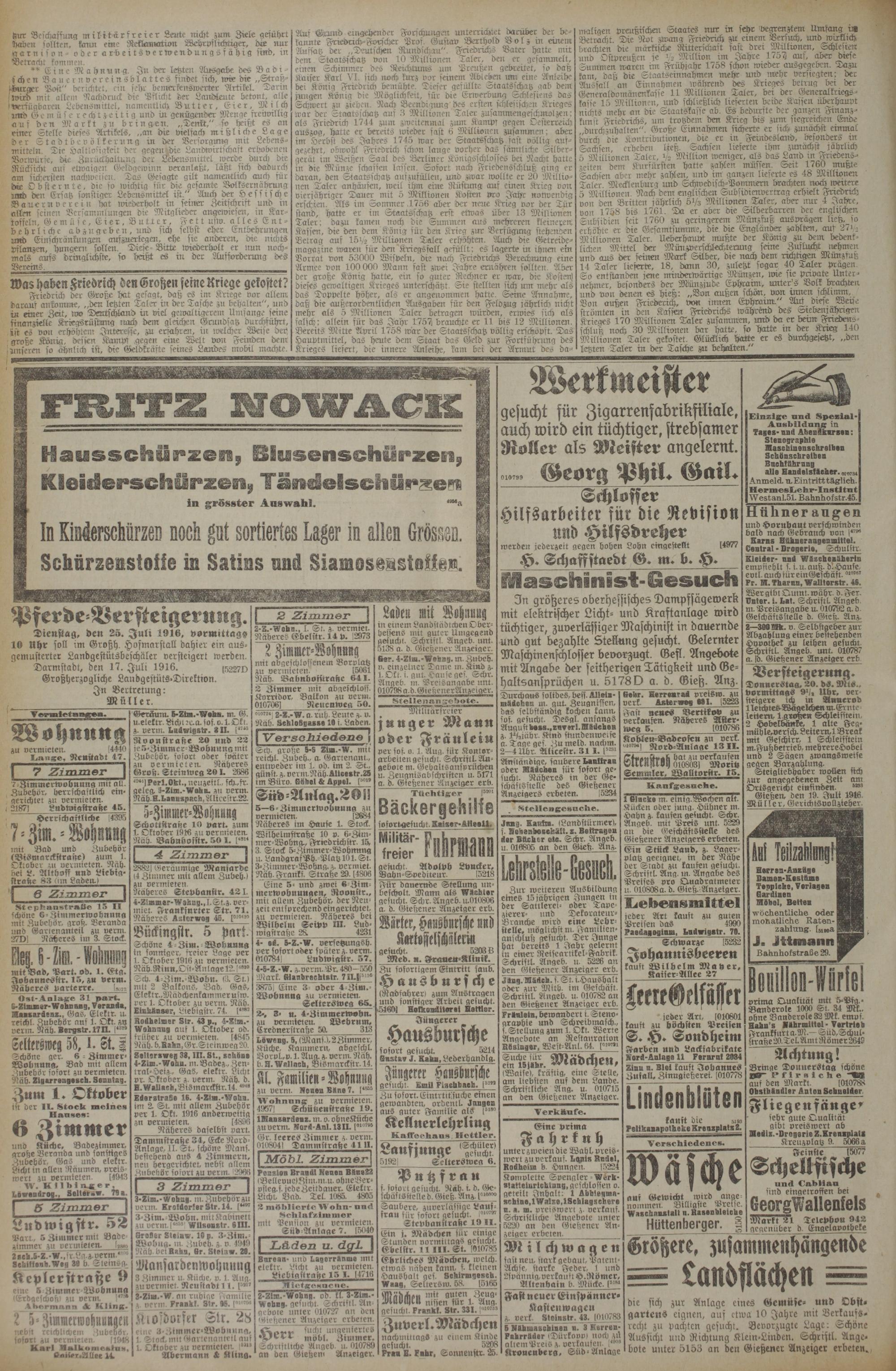 19 Uhr soll im Großh. Hofmarftall dahier ein ausgemusterter Landgestütsbeschäler versteigert werden. Darmstadt, den 17. Juli 1916. [ 5227 D