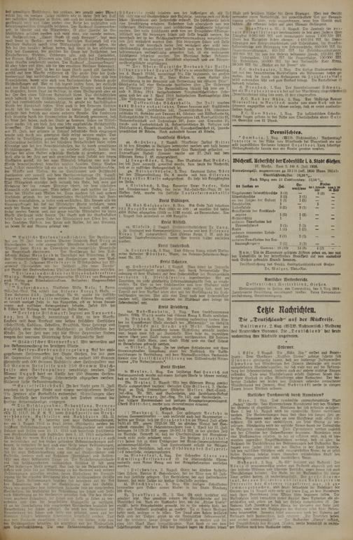 ga. Grünberg, 2. August. Musketier Julius Ritter ist in den Kämpfen in Galizien verwundet worden und bald darauf in einem Feldlazarett den Heldentod fürs Vaterland gestorben. — Unteroffizier Rudolf Zimmer würde am 27. Juli mit dem Eisernen Kreuz 2. Kl. ausgezeichnet.