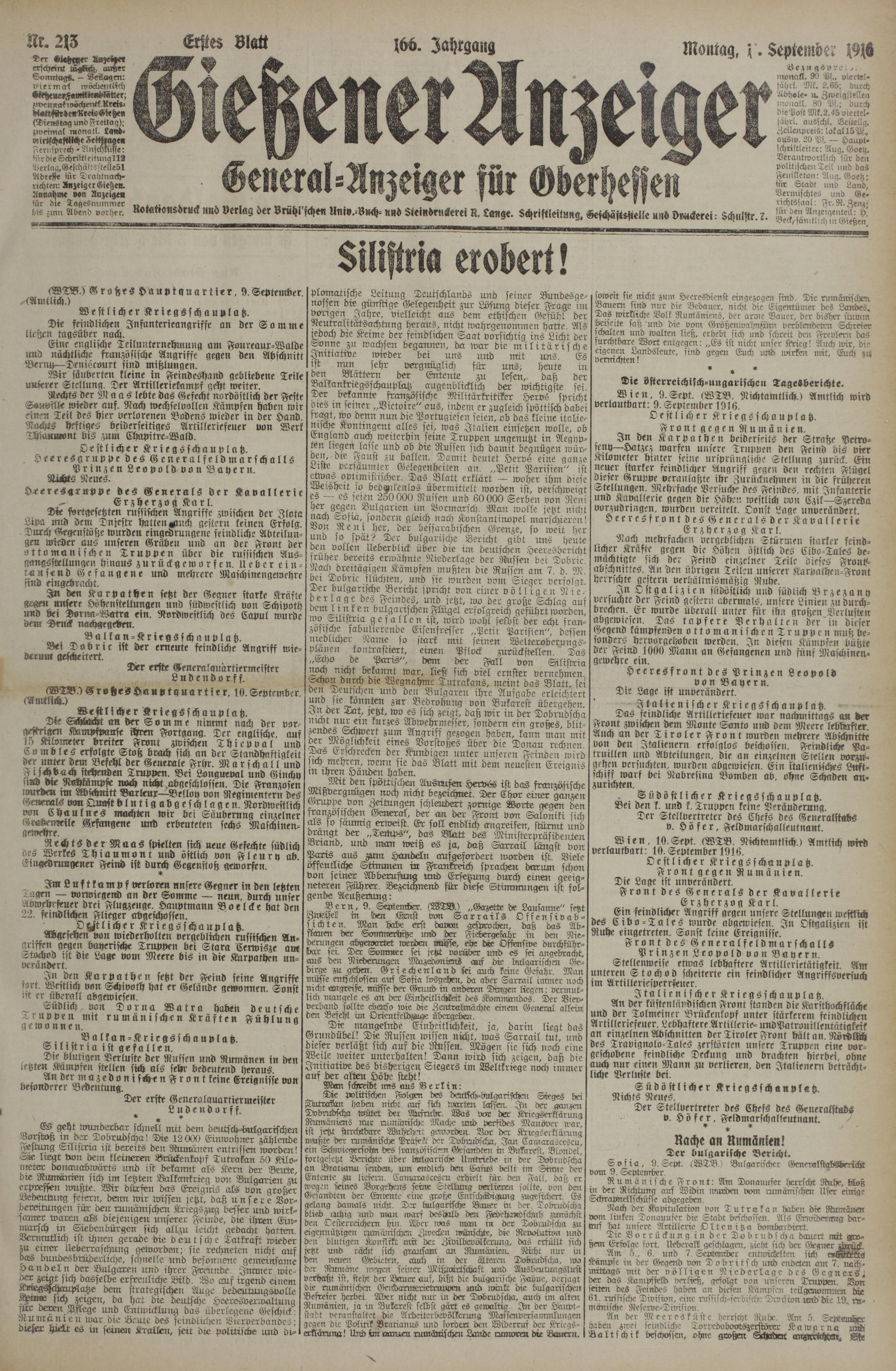 Wien, 10.Sept. (WTB. Nichtamtlich.) Amtlich wird verlautbart.' 10. September 1916.