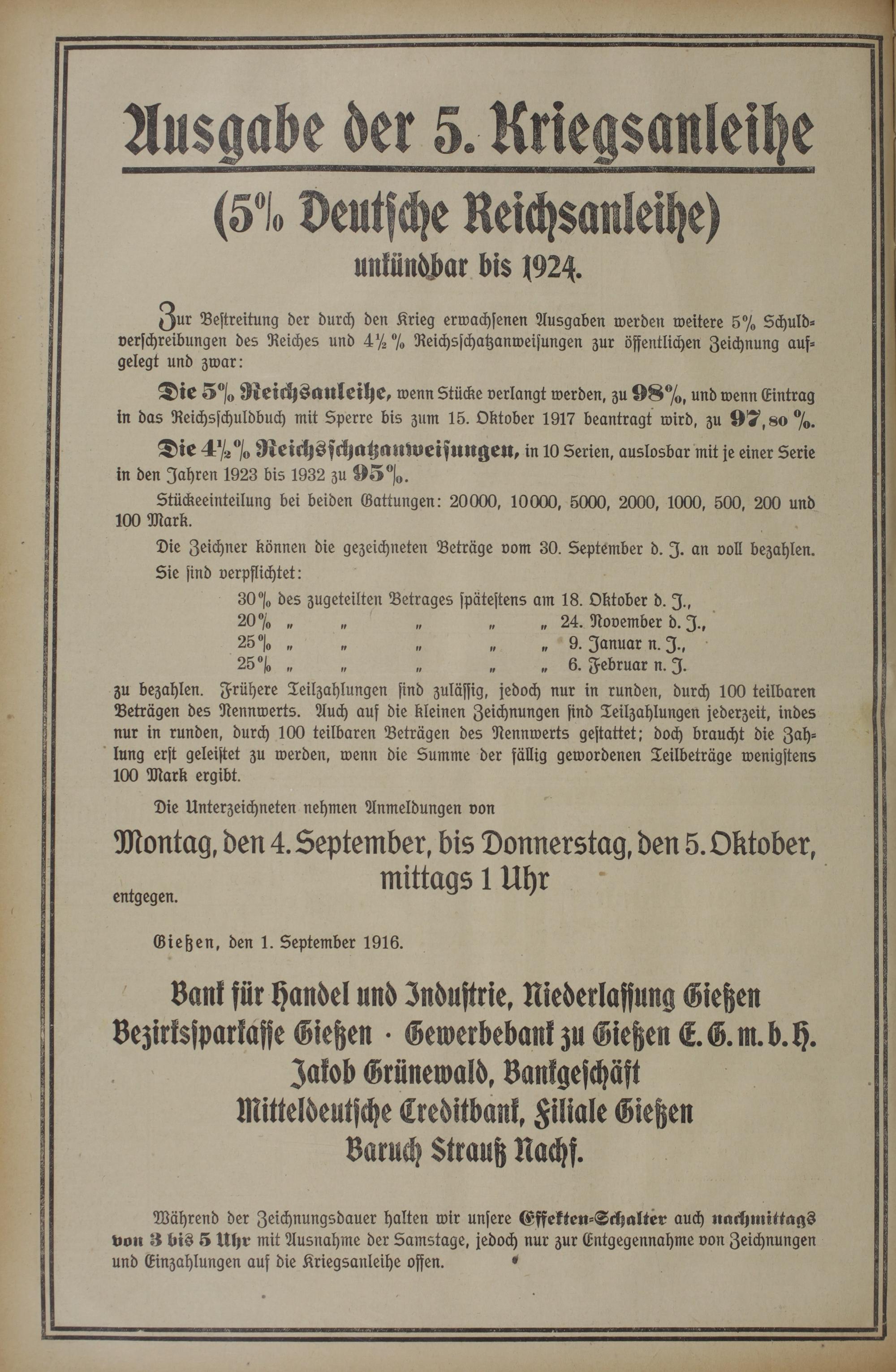 Während der Zeichnungsdauer halten wir unsere Effekten-Sch alter auch nachmittags von 3 bis 5 Uhr mit Ausnahme der Samstage, jedoch nur zur Entgegennahme von Zeichnungen und Einzahlungen auf die Kriegsanleihe offen. *