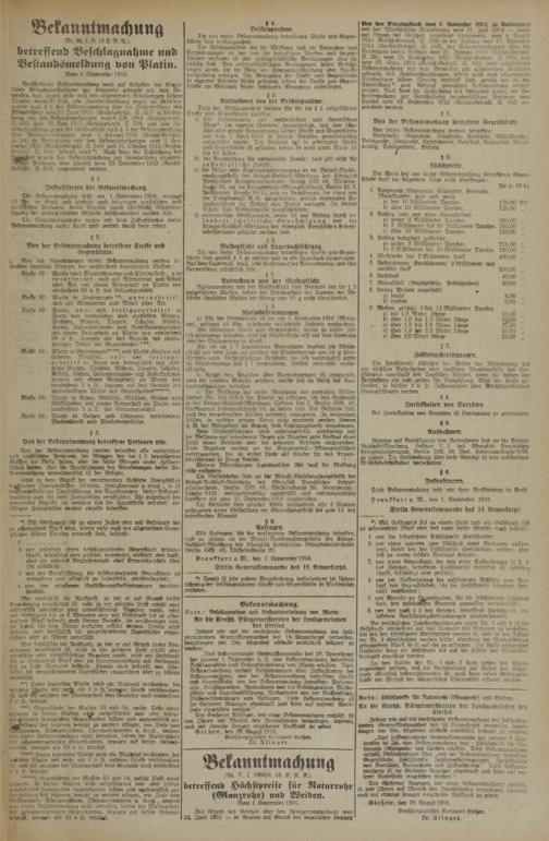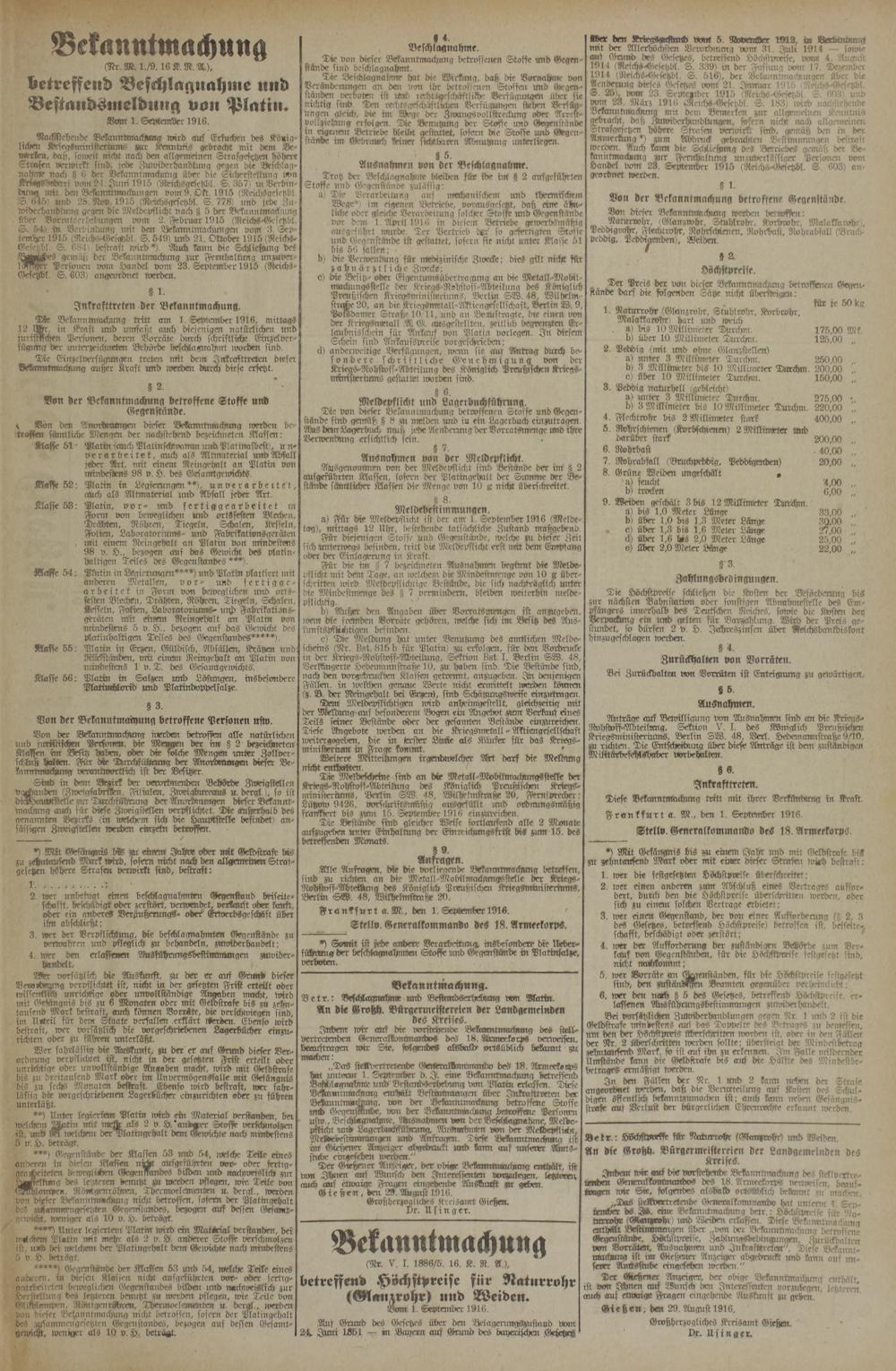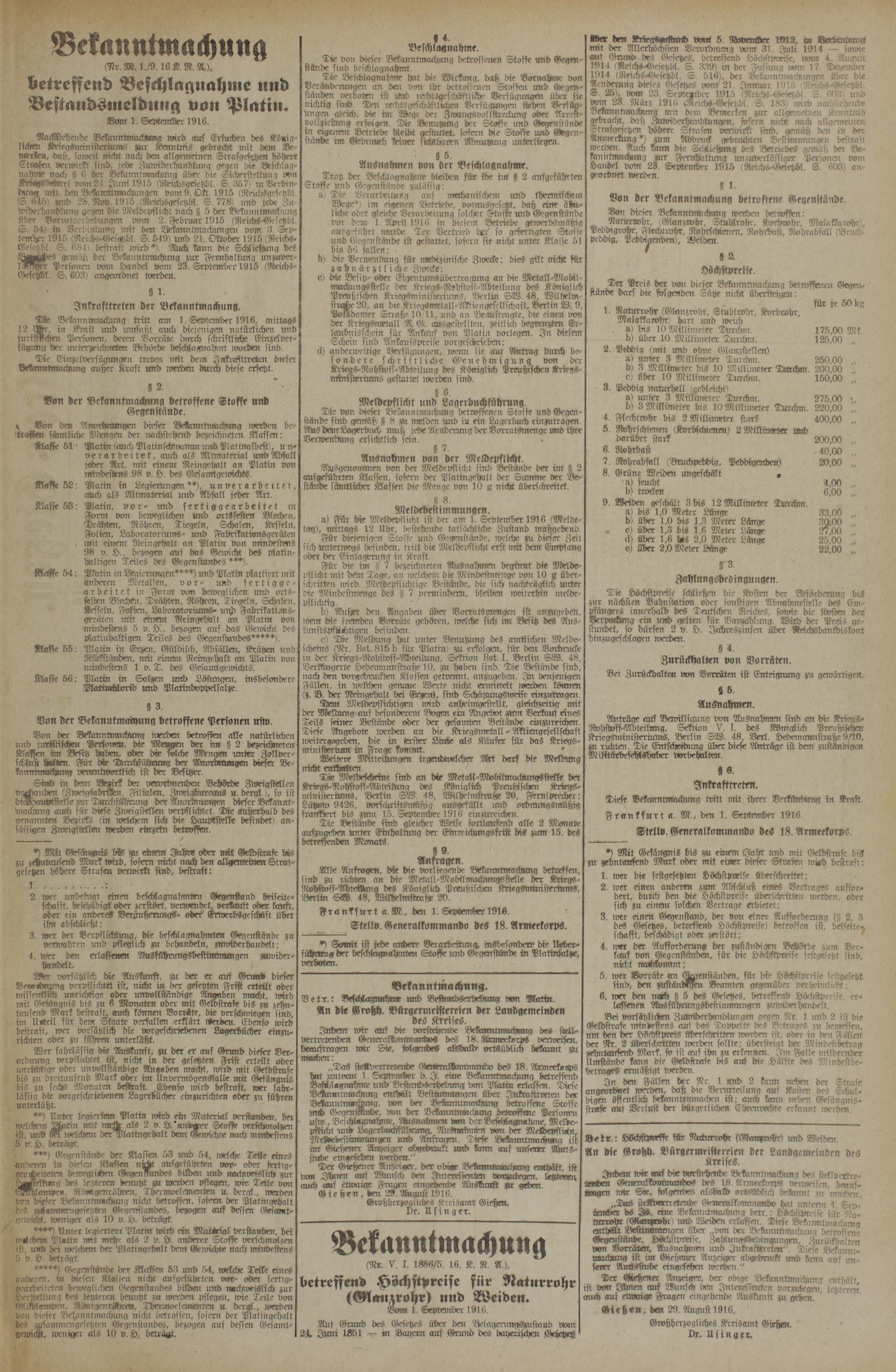 „Das steNw-rtretende Genreraldornmondo des 18. ?lrmeekovps hat Mtevm 1. September d. I. eine Bckanntrnachung betrvffeitd Befflst«gnahmje und Veftands(whel.mnig von Platin erlass-en. Diese Bcklaumtmacknmg enthält Bestimmungen über Iukrafttveten der BekaunImNchsmg, von der BeVcrnntnrachmvg betroffene Stoffe rmd (^egensmnd-e. Von der BekanntmiackMUg betvoffene Personen Usw., Beschmgnahnte, ddrsnahmcm von der Beftlillagnadme, Melb>e- pfticht toid Lagerbuchftffngmig, Ansmrhinlen von der VLeLepflüiit, MeHdebestimmungen und ÄTrfragen. Tiefe Bekanntmachimg ist im! Gioßener Anzeiger abgedruckt und karrn auf unserer Amtsstube eingesehen n>erden."