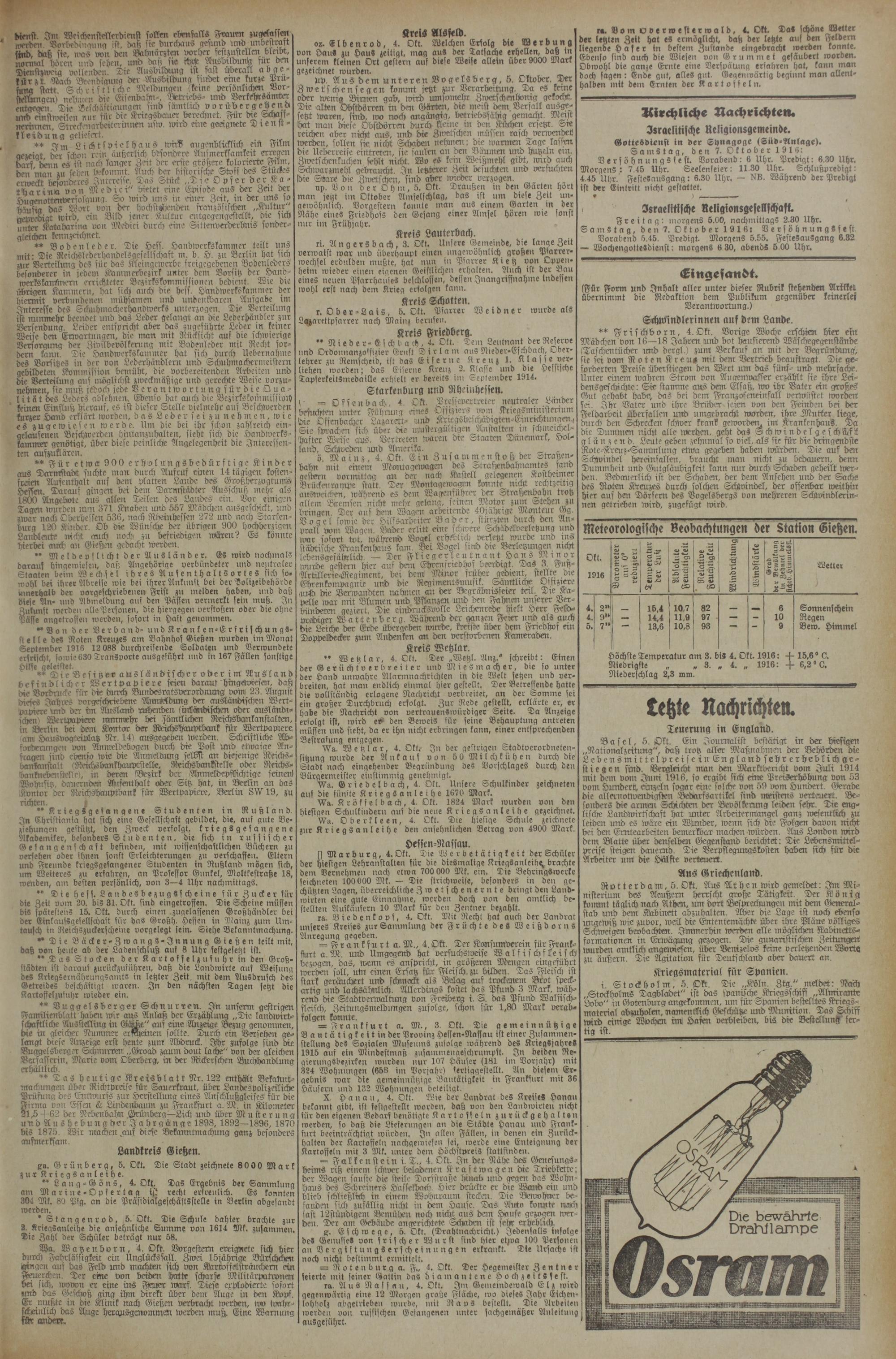 Freitag: inorgens 5.00, nachmittags 2.30 Uhr. Samstag, den 7. Oktober 1916: Versöhnungsfest Vorabend 5.45. Predigt. Morgens 5.55. FesteSausgang 6.32 — WochengotteSdienst: morgens 6 30, abends 5.00 Uhr.