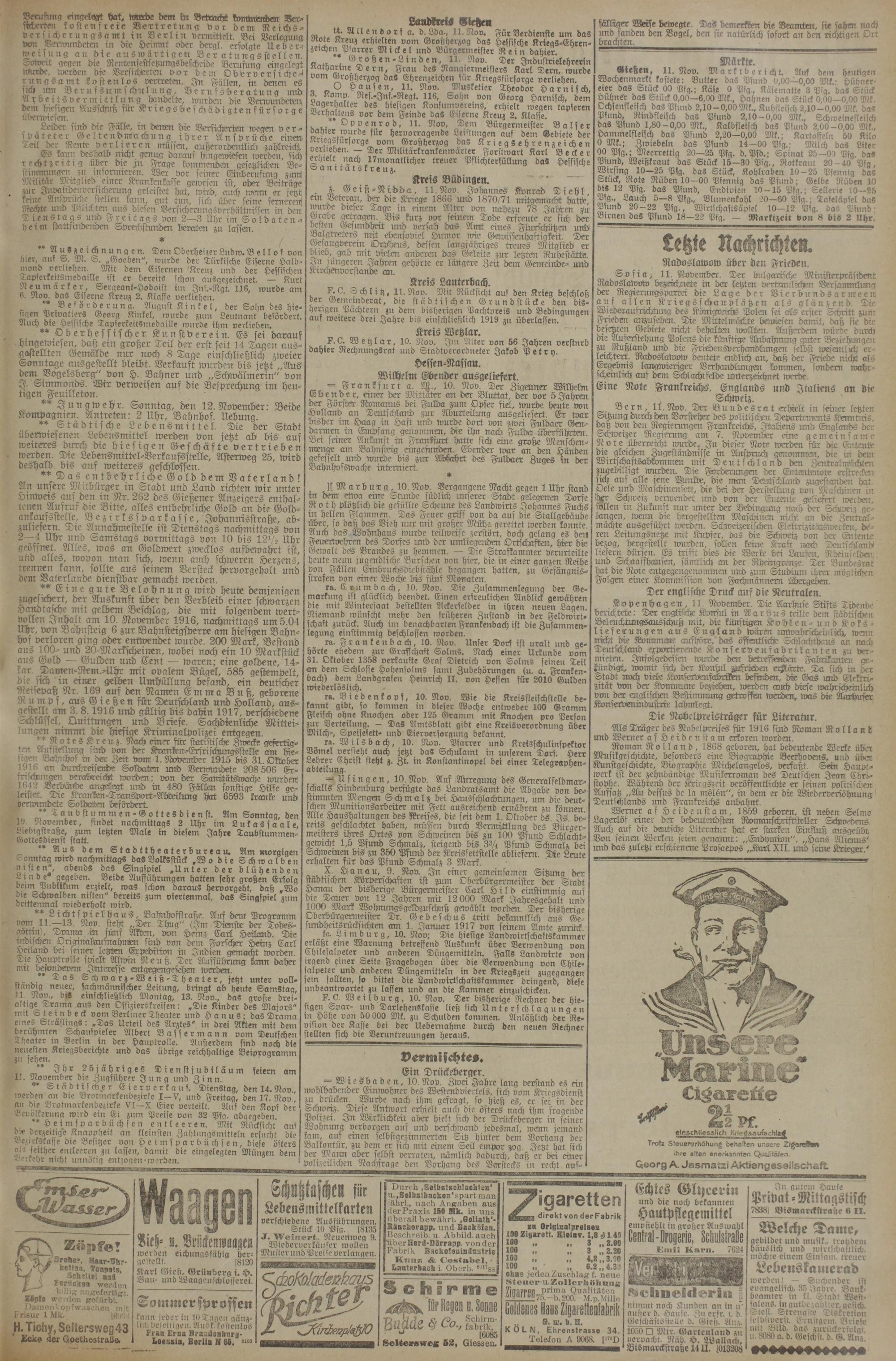 ** Das entbehrliche Gold dem Vaterland! An unsere Mitbürger in Stadt und Land richten wir unter Hinweis auf den in Nr. 262 des Gießener Anzeigers enthaltenen Aufruf die Bitte, alles entbehrliche Gold an die Goldankaufsstelle, Bezirkssparkasse, Johannisstraße, abzuliefern. Die Annahmestelle ist Dienstags nachmittags von 2—-4 Uhr und Samstags vormittags von 10 bis 12V* Uhr geöffnet. Alles, was an Goldwert zwecklos aufbewahrt ist, und alles, wovon man sich, wenn auch schweren Herzens, trennen kann, sollte aus seinem Versteck hervorgeholt und dem Vaterlande dienstbar gemacht werden.