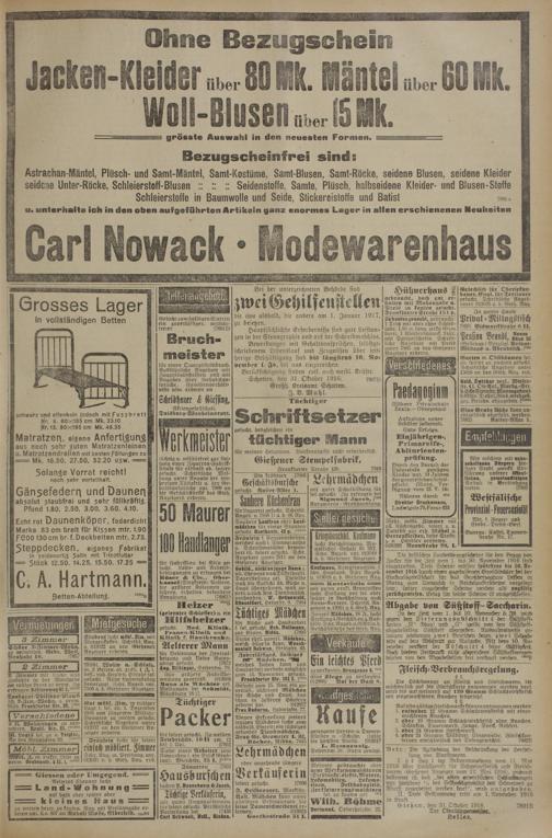 Berücksichtigung finden evtl, auch meibl. Kräfte. Schotten, den 31. Oktober 1916. 7907D