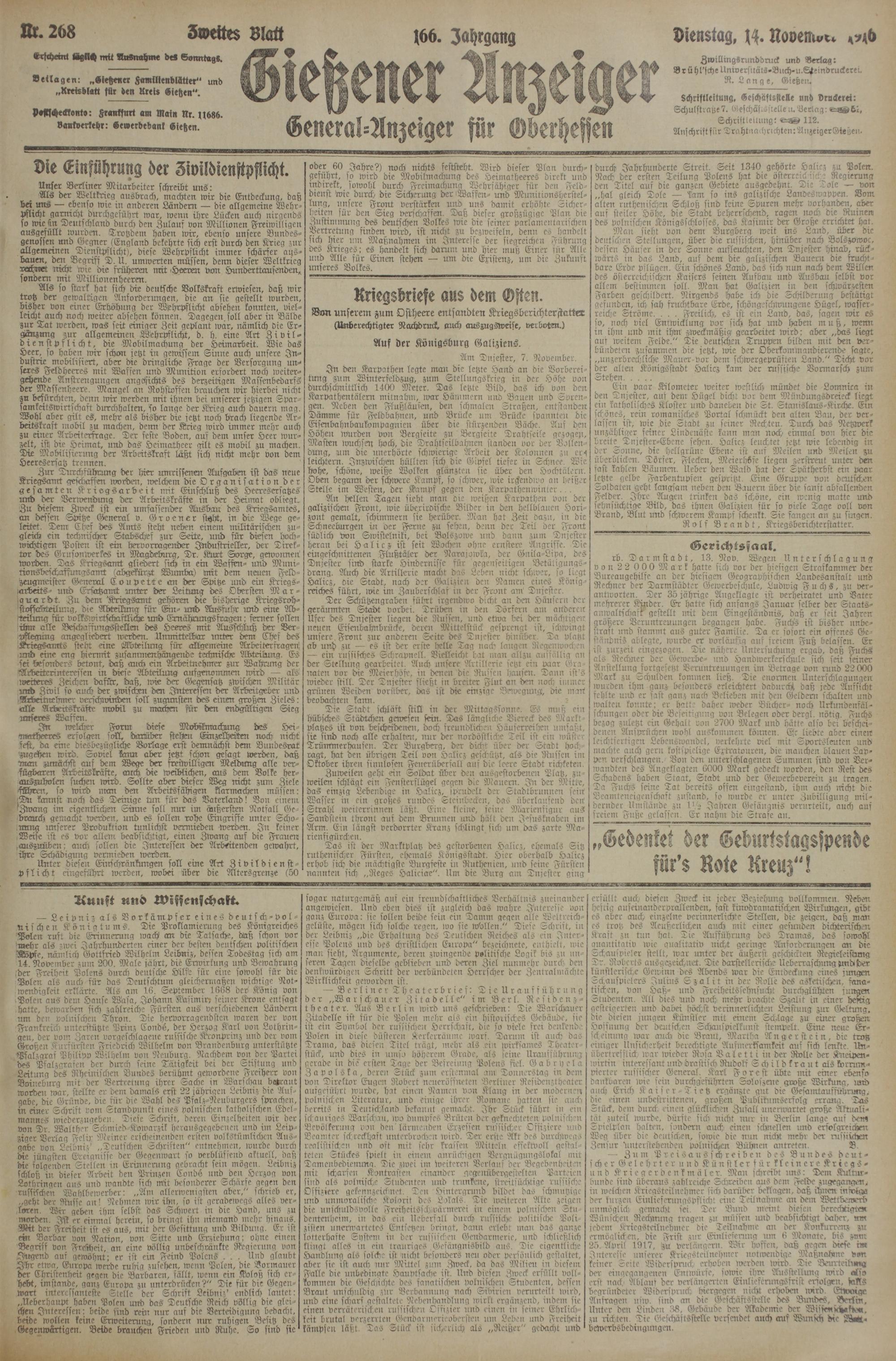 — Z u m Pr e i sa u s sch rei b e n des Bundes heut- s ch er Gele h r t e r und Künstler für kleinere Kriegs- n n d Kriegerdenkmal e r. Man schreibt :ms: Dem Kulttir- bunde sind überaus zahlreiche Schreiben aus dem Felde zugegangen^ ::: welchen Kriegsteilnehmer sich darüber beklagen, daß ihnen inioft-s der turzcn Einlieferungspfficht eilte Teilnahme an dem Wettbewerb unmöglich gen:acht sei. Der Bund nieint diesen berechtigt« Wünsche:: Rechmmg trage:: zu müssen uub beabsichtigt daher, uw jedem Kriegsteilnehmer die Teilnahme an der Kvnkurre:^ zu ermöglichen, die Frist zur .Einlieftmng um 6 Rtonate. bis zun: 25. April 1917, 'zu verlängern. Wir hoffen, daß gegen diese m Interesse unserer Kriegsteilnehmer :wtwendige Maßnahrne von keiner Seite Widerspruch erhoben werden :vftd. Die Beurteittm^ der: eingegangenen Ennvürfe, sowie ihre Ausstellung wird also erst nach Ablauf der verlängerten Einlieferungsfrist: erfolgen, falls begründeter Widerspruch hiergegen nicht erfroben wird Etwaige Anfragen nsw. sind an die Geschäftsstelle des B:rndes, Berlin. Unter den Linden 38, Gebäude der Mademie der Wisftnichsft,'«. zu richten. Die Geschäftsstelle versmdet auch auf Wunsch die WM- bewerbsbedtMungen.