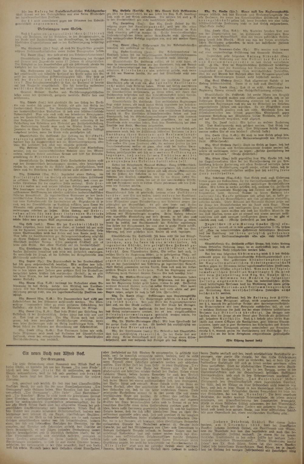Inzwischen geht folgender Antrag Albrecht (Soz.) ein, der eine Sicherung auf dem Gebiet des Vereins» und Versammlungsrechts in das Gesetz aufnehmen will.- „§ 13a. Den im Vaterländischen Hilfsdienst beschäftig, ten Personen darf die Ausübung des Vereins- und Bersamm» lungsrechtes zur Vertretung ihrer wirtschaftlichen Interessen, über die auf Grund des Gesetzes über den Belagerungszustand erlassenen Verordnungen hinaus, nicht beschränkt werden."