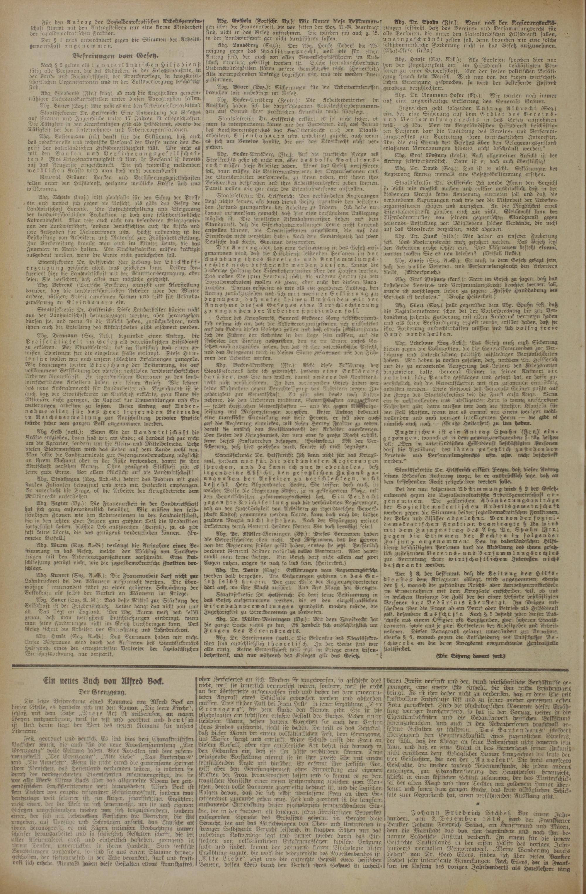 Staatssekretär Dr. Helfferich: Eine Anwendung des Gesetzes auf Frauen und Jugendliche unter 17 Jahren ist ausgeschlossen. Die Tätigkeit in den Krankenkassen gilt als Hilfsdienst, ebenso die Tätigkeit bei den Unternehmer- und Arbeiterorganisationen.