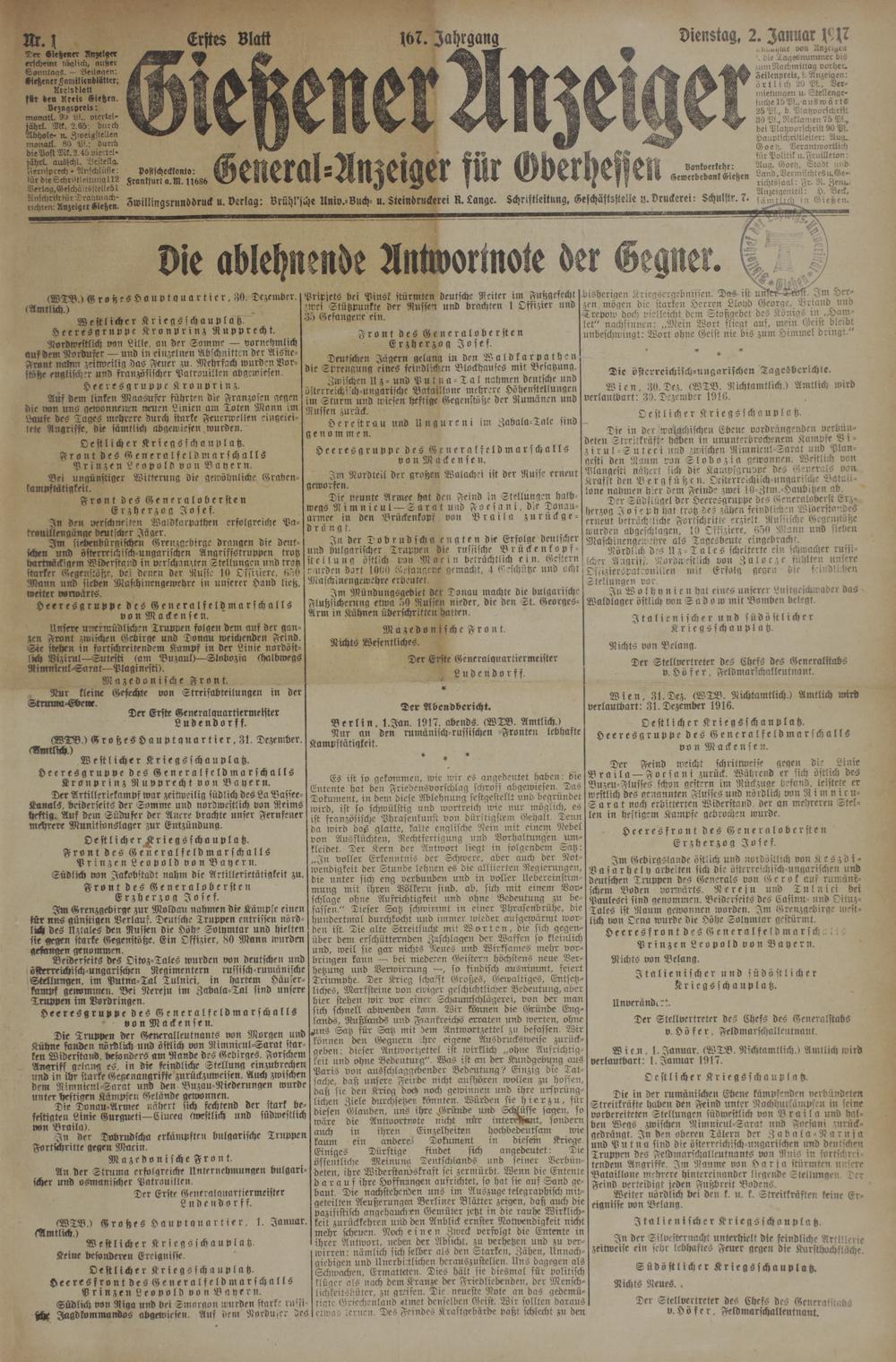 D i eil, 1. Januar. (WTB. Nichtamtlich.) Amtlich wird verlautbart: 1. Januar 1917.