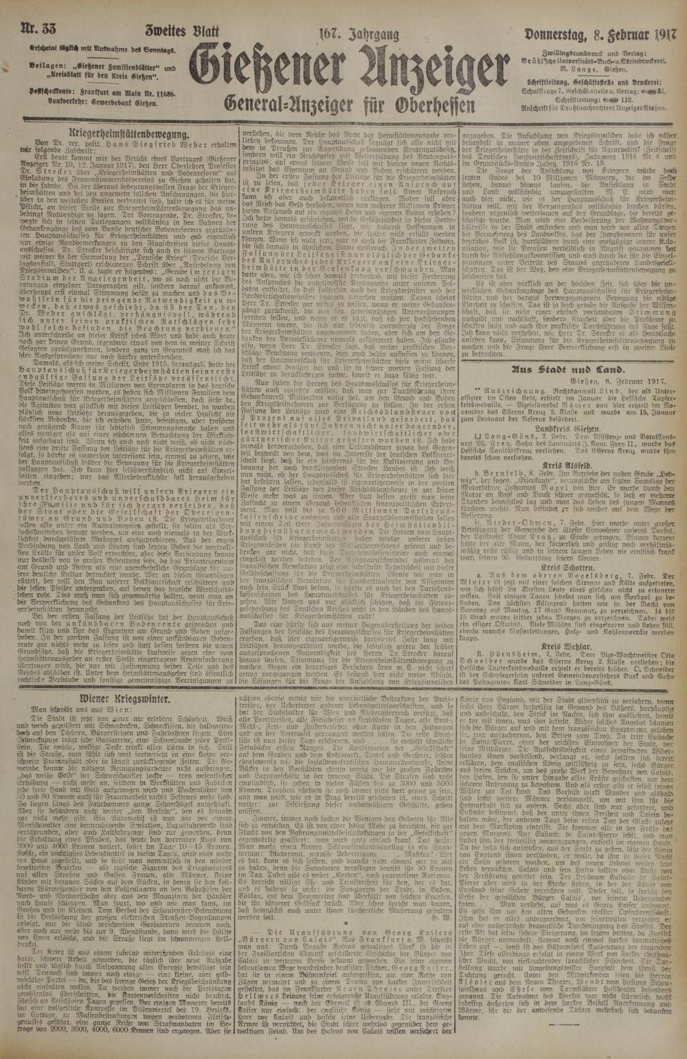 R. Hörnsheim, 7. Febr. Dern Vne-Wachtmeister Otto Schneider wurde daS Eiserne Kreuz 2. Klasse verliehen; die Hessische Tnvferkeitsmedaille erhielt er bereits früher. O. Schneider ist der Schiviegersohn unseres Geineindevorstehers Dnrk und Sohn des Postagcnten Karl Schneider in Lang-GönS.