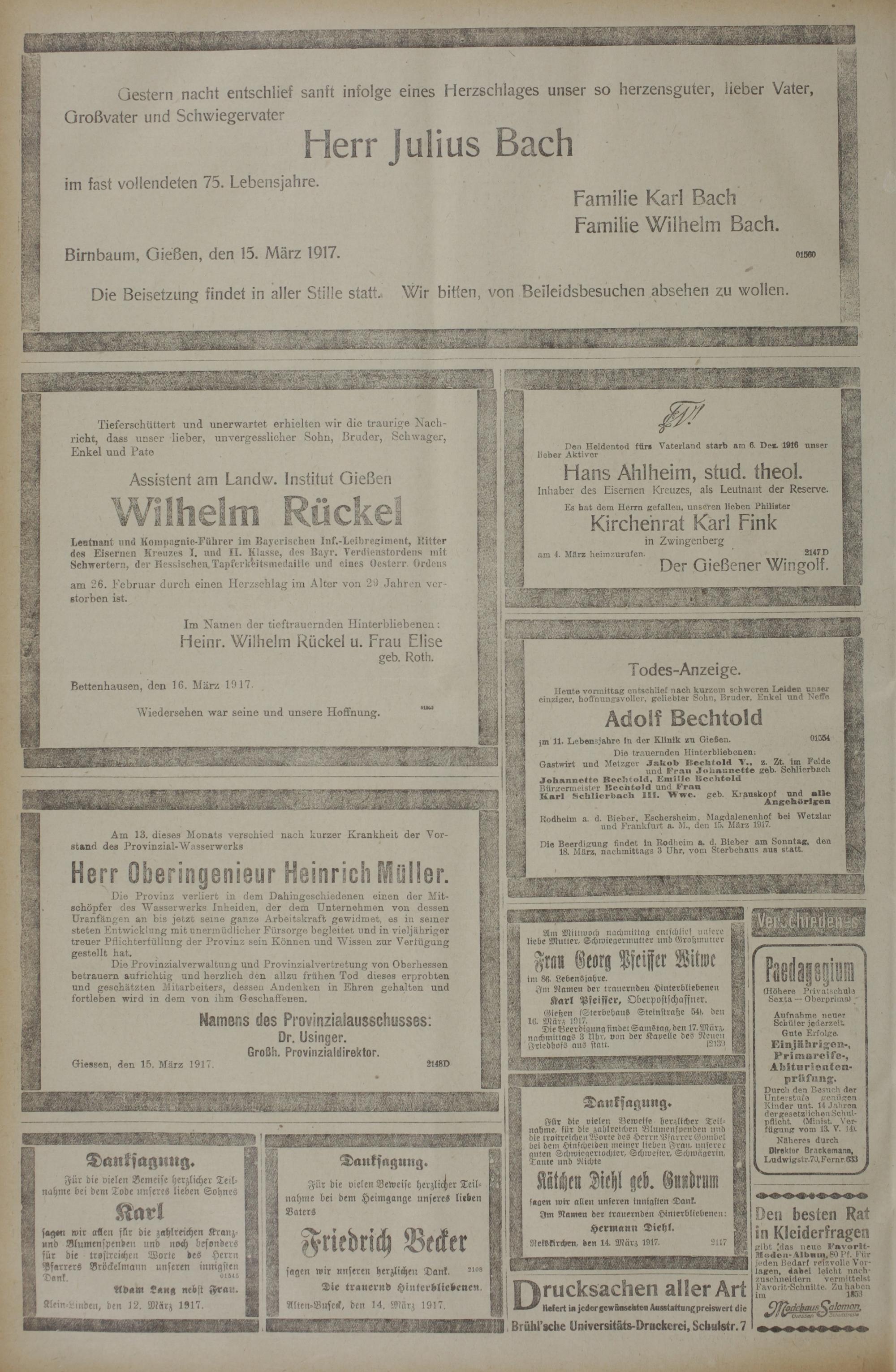 Jm Namen der trauernden Hinterbliebenen Karl Pfeiffer. Oberpostschaffner. Gietzen lSterbehauS Steinstrabe 541, den 16. März 1017. ^