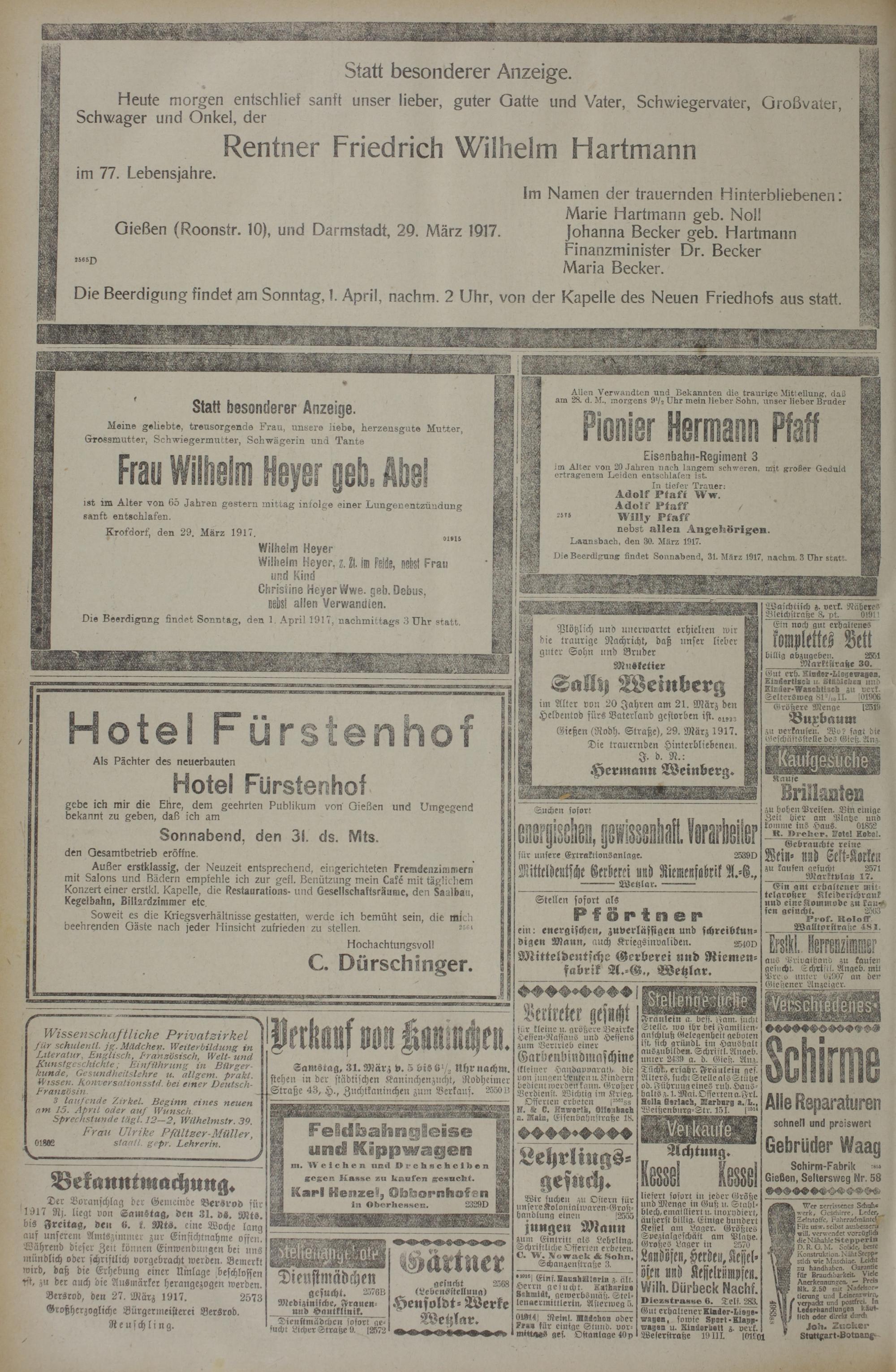 Die Beerdigung findet Sonntag, den 1. April 1917, nachmittags 3 Uhr statt.