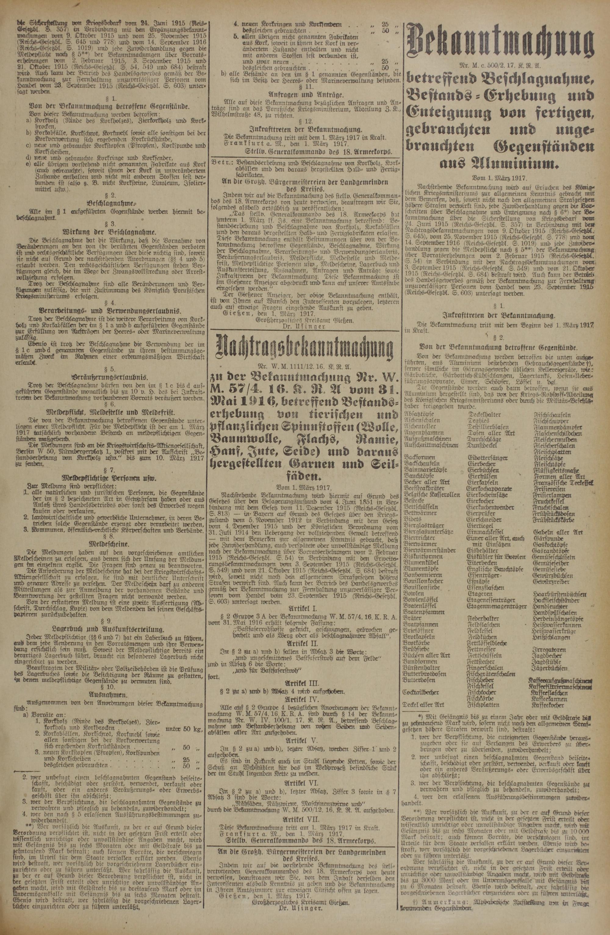 Indem wir auf die Bekanntmachung des stellv. Generalkommandos des 18. Armeekorps von heute verweisen, beauftragen wir Sie, folgendes alsbald ortsMich zu veröffentlichen: