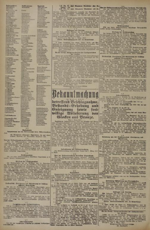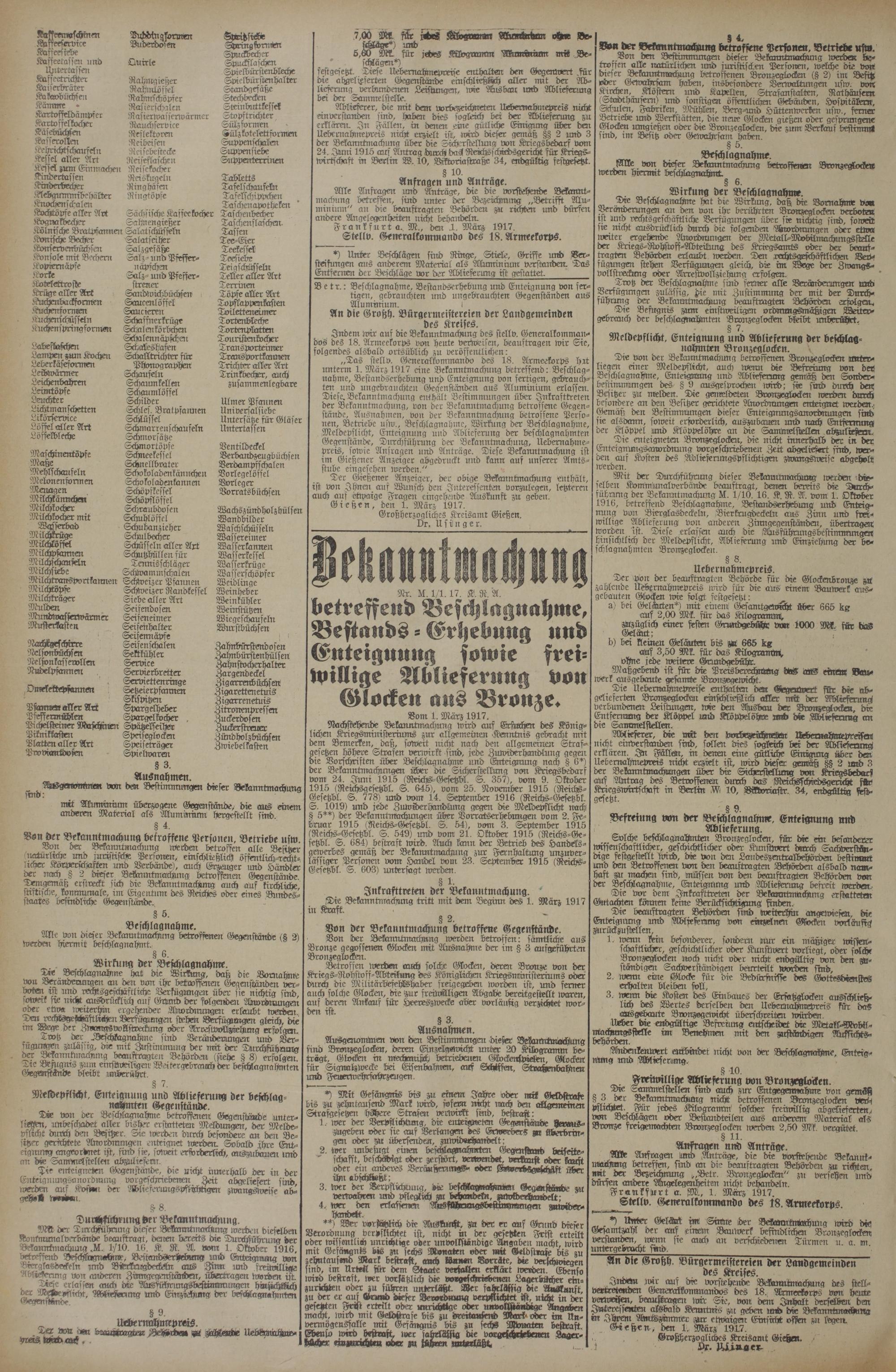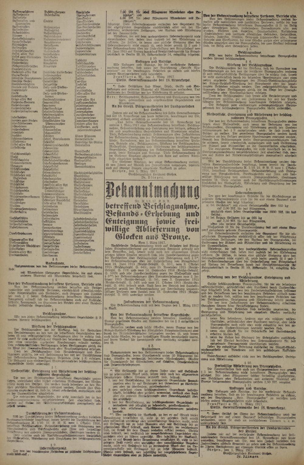 „Das stellv. Generalkommando des 18. Armeekorps Hit unterm 1. März 1917 eine Bekanntmachung betreffend: Beschlagnahme, Bestandserhebung und Enteignung von ferttgen, gebrauchten und ungebrauchten Gegenständen aus Aluminium erlassen. Diese. Bekanntmachung enthält Bestimmungen über Inkrafttreten der Bekanntmachung, von der Bekannttnachung bettoffene Gegenstände, Ausnahmen, von der Bekanntmachung betroffene Personen, Betriebe usw., Beschlagiiahme, Wirkung der Beschlagnahme, Meldepflicht, Enteignung und 2lblieferung der beschlagnahmten Gegenstände, Durchführung der Bekanntmachung, Uebernahme- preis, sowie Anfragen und Anträge. Diese Bekanntmachung ist im Gießener Anzeiger abgedruckt und kann auf unserer Amtsstube eingesehen werden."