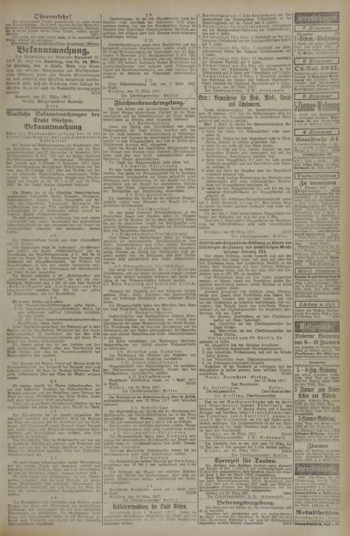 Tie Friedhöfe sind in der Zeit vom 16. März bis 15. Mai von 6 Uhr morgens bis 8 Uhr abends geöffnet Gießen, den 29. März 1917. 25608
