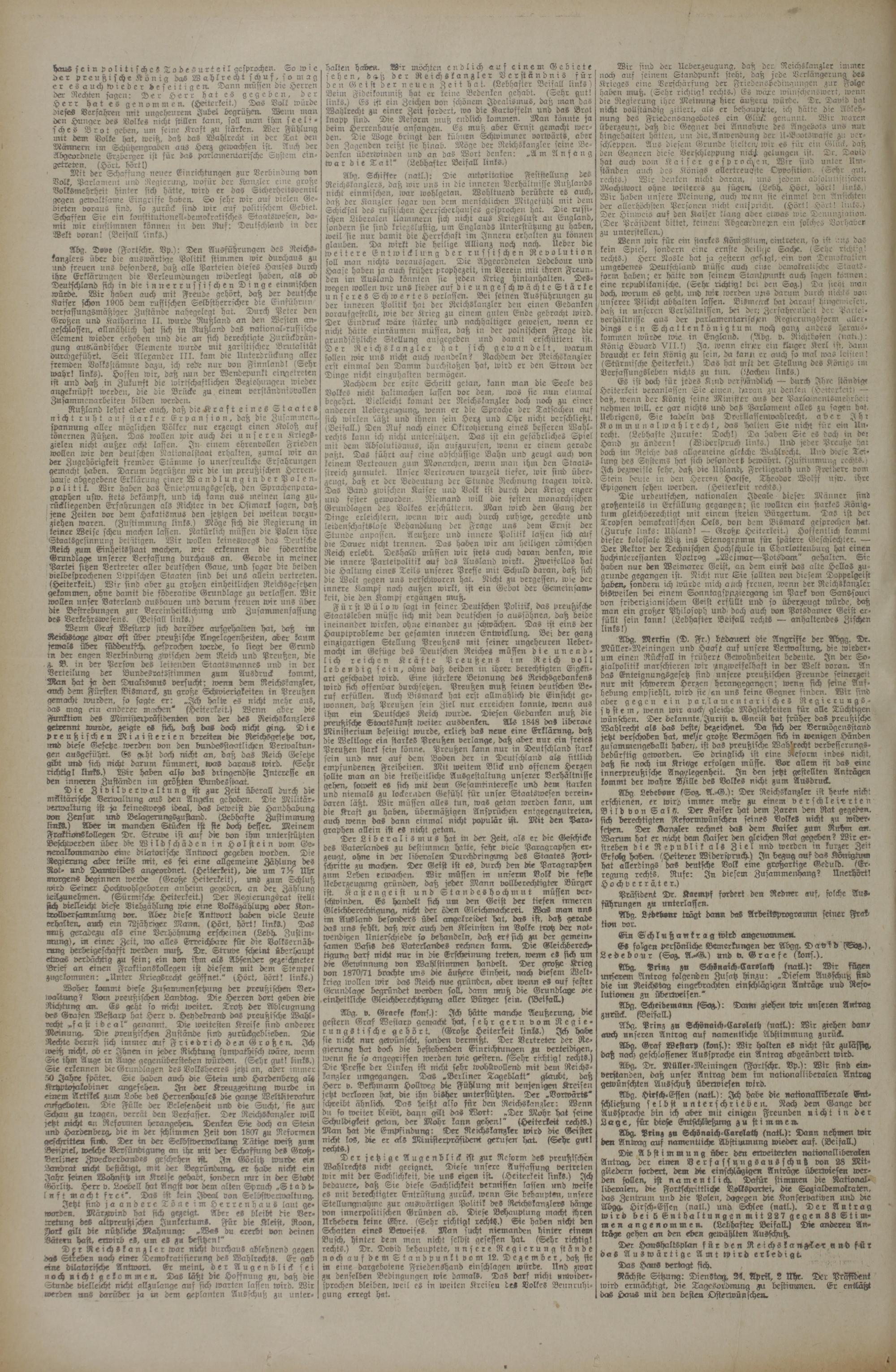 Nächste Sitzung: DienSbcm, 24. April, 2 Uhr. Der Präffdent lvird errnächtigt, die Tagesordnung Al bestimanen. Er entlaßt doS HauS mit den beste« Qsterwünscheu.