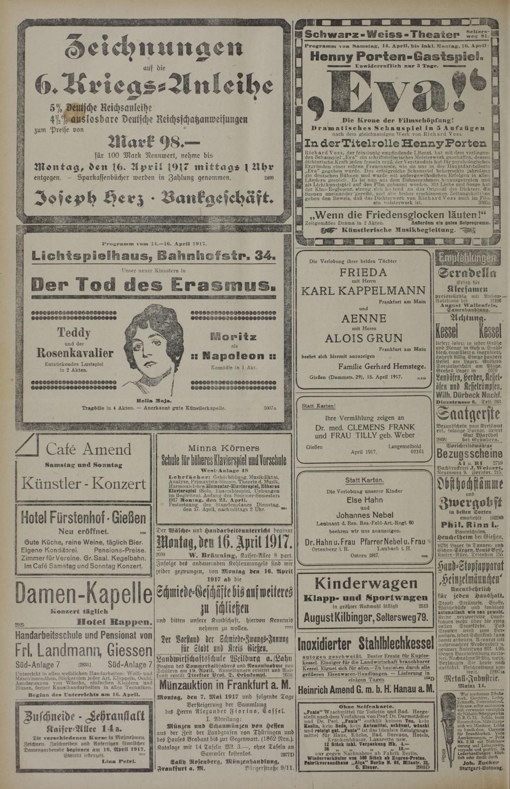 Infolge deS andauernden Kohlenmangels sind wir leider gezwungen, von Montag den 16. April 1917 ab die