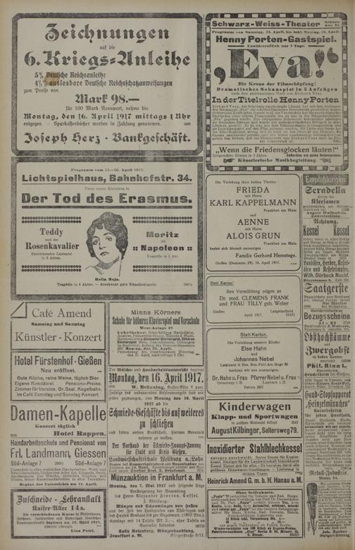 Die verschiedenen Korse in Maffnehmen, Zeichnen. Zuschnetden und Anferttgen sämtlicher Damengarderobe beginnen am 16. April 1917.