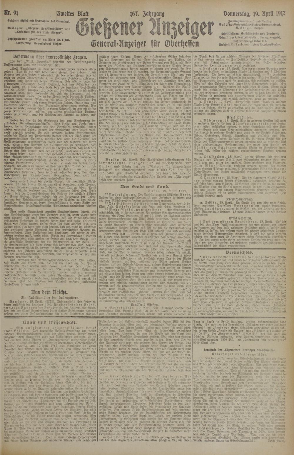 a. Langd, 17. Aprll. Vorgestern abend sprach in unserer Kftche Herr Lehrer Jakob aus Ober-Bessingen über Vollsernäh- rung im Ktiege. Es ist zu erhoffen, daß die sachkundigen Aussüb- rungen des Redners auch in unserer Gemeinde fruchtbaren Boden gefunden haben.