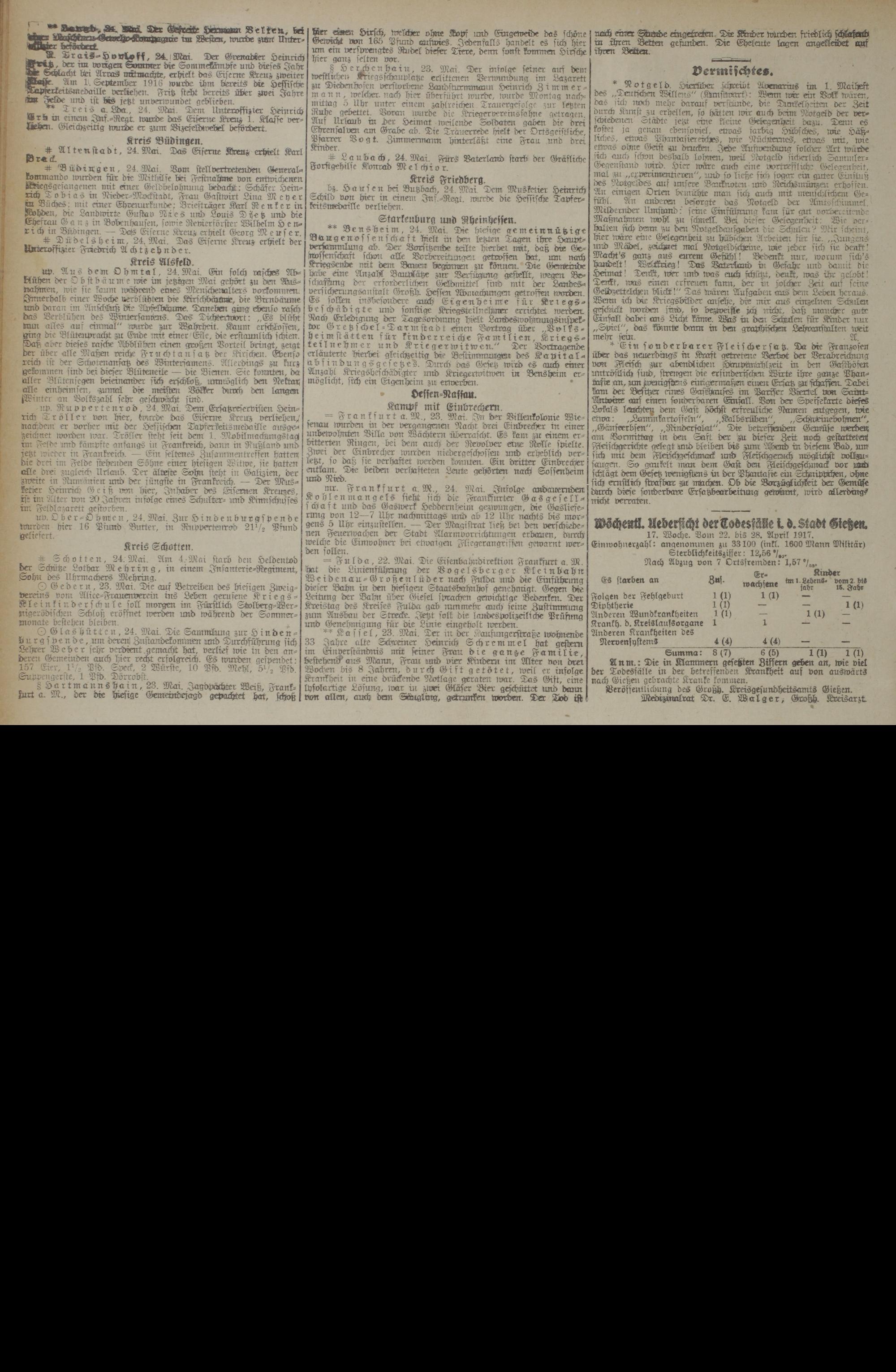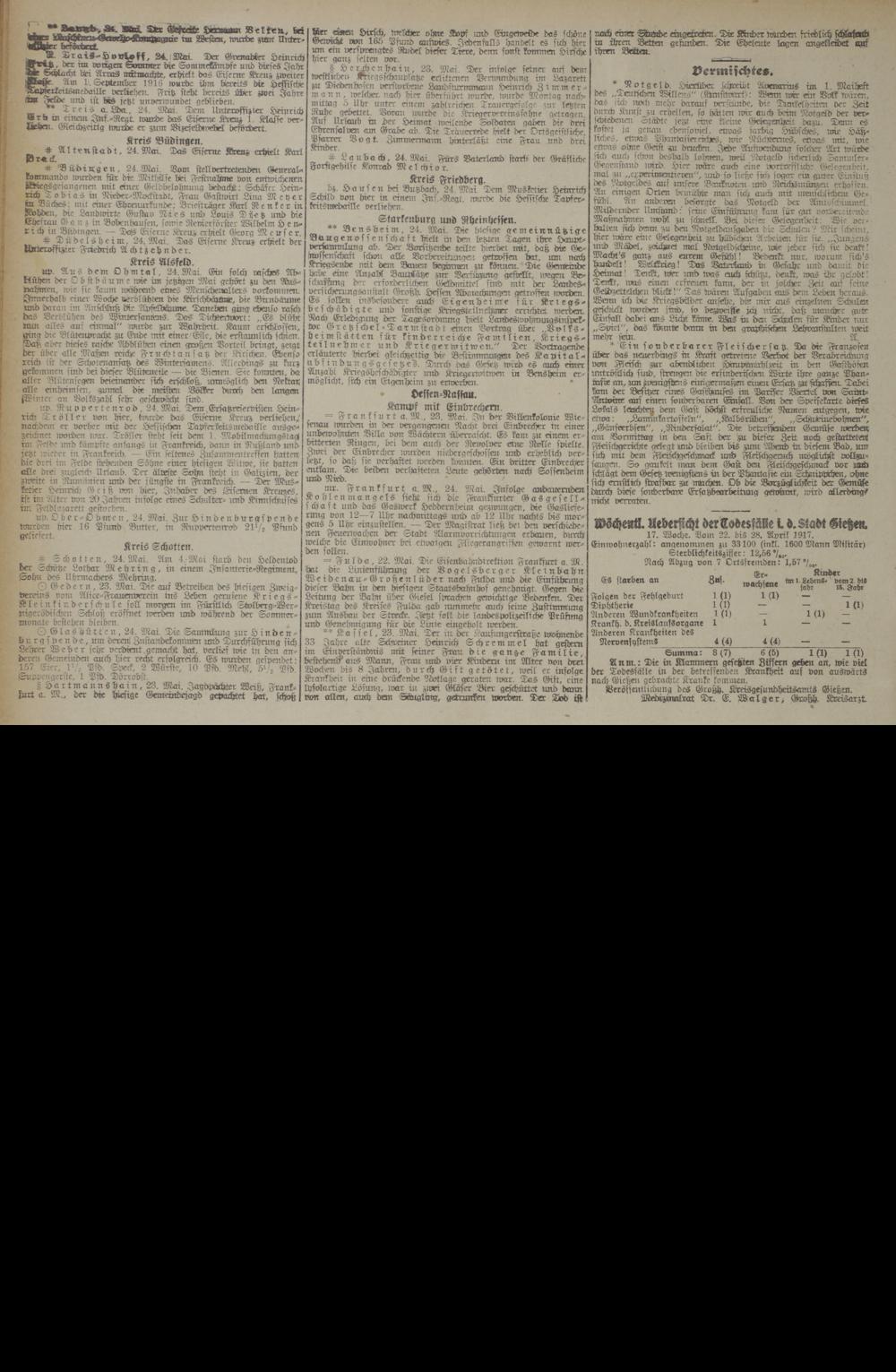 17. Woche. Dom 22. bis 28. April 1917. Einwohnerzahl: angenommen zu 33100 (inkl. 1600 Mann Militär) Sterblichkeitsziffer: 12,56 •/ M .