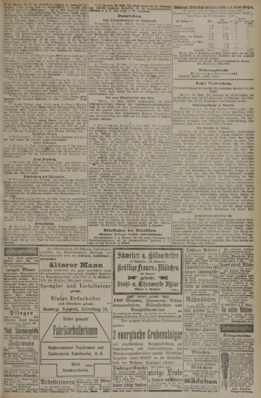 34. Woche. Vom 19. August bis 25. August 1917. Einwohnerzahl: angenommen zu 33100. Sterblichkeitsziffer: 20,39 Nach Abzug von 8 Ortsfremden: 7,85