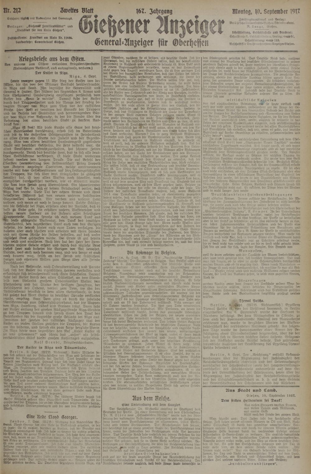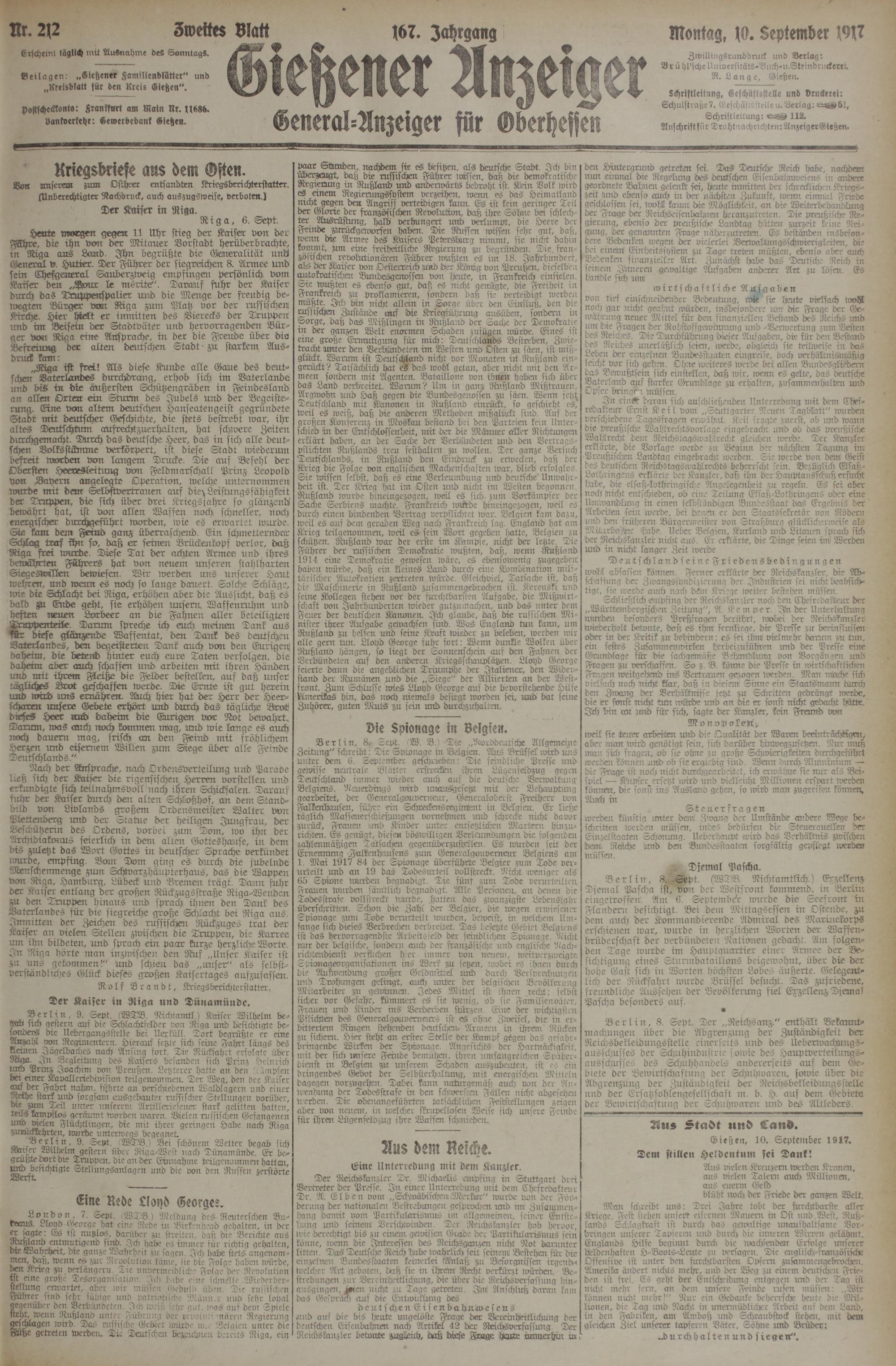 „Riga ist frei! Als diese Kunde alle Gaue des deutschen Baterurndes durchdrang, erhob sich im Baterlande und bis in die äußersten Schützengräben in Feindesland an allen Orten ein Lckurin des Jubels Und der Begeisterung. Eine von altem deutschen Hanseatengeist gegründete Stadt mit deutscher Geschichte, die stets bestrebt war, ihr altes Deutschtum aUsrechtzuerhalten, hat schwere Zeiten durchgemacht. Durch das deutsche Heer, das in sich alle deutschen Volksstckmme verkörpert, ist diese Stadt wiederum befreit worden von langem Drucke. Die auf Befehl der Obersten Heeresleitung von Feldmarschall Prinz Leopold von Bayern angelegte Operation, welche unternommen wurde mit dem Selbstvertrauen auf die> Leistungsfähigkeit der Truppen, die sich über drei .^triegsjahre so glänzend/ bewährt hat, ist von allen Waffen noch schneller, noch energischer durchgeführt worden, wie es erwartet wurde.