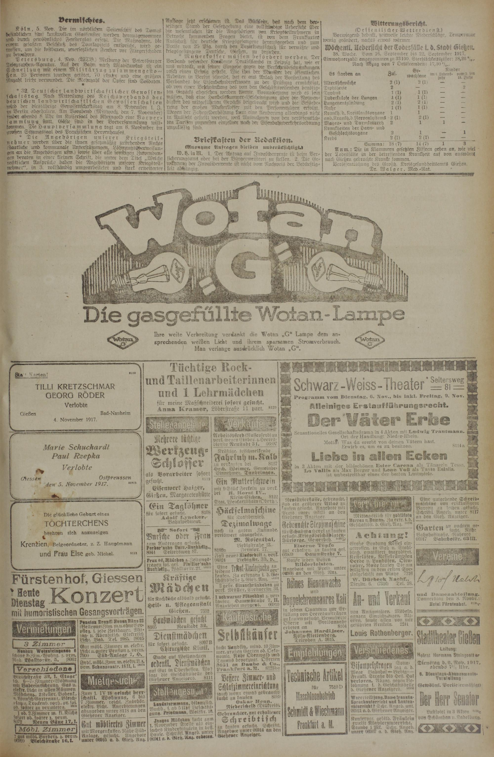 38. Woche. Vo:n 16. Septeinber bis 22. September 1917. Einwohnerzahl: angenominen zu 33100. Sterblichkeitsziffer: 28,26'/,.. Nach Abzug von 7 Ortsfremden: 17,30'/,,.