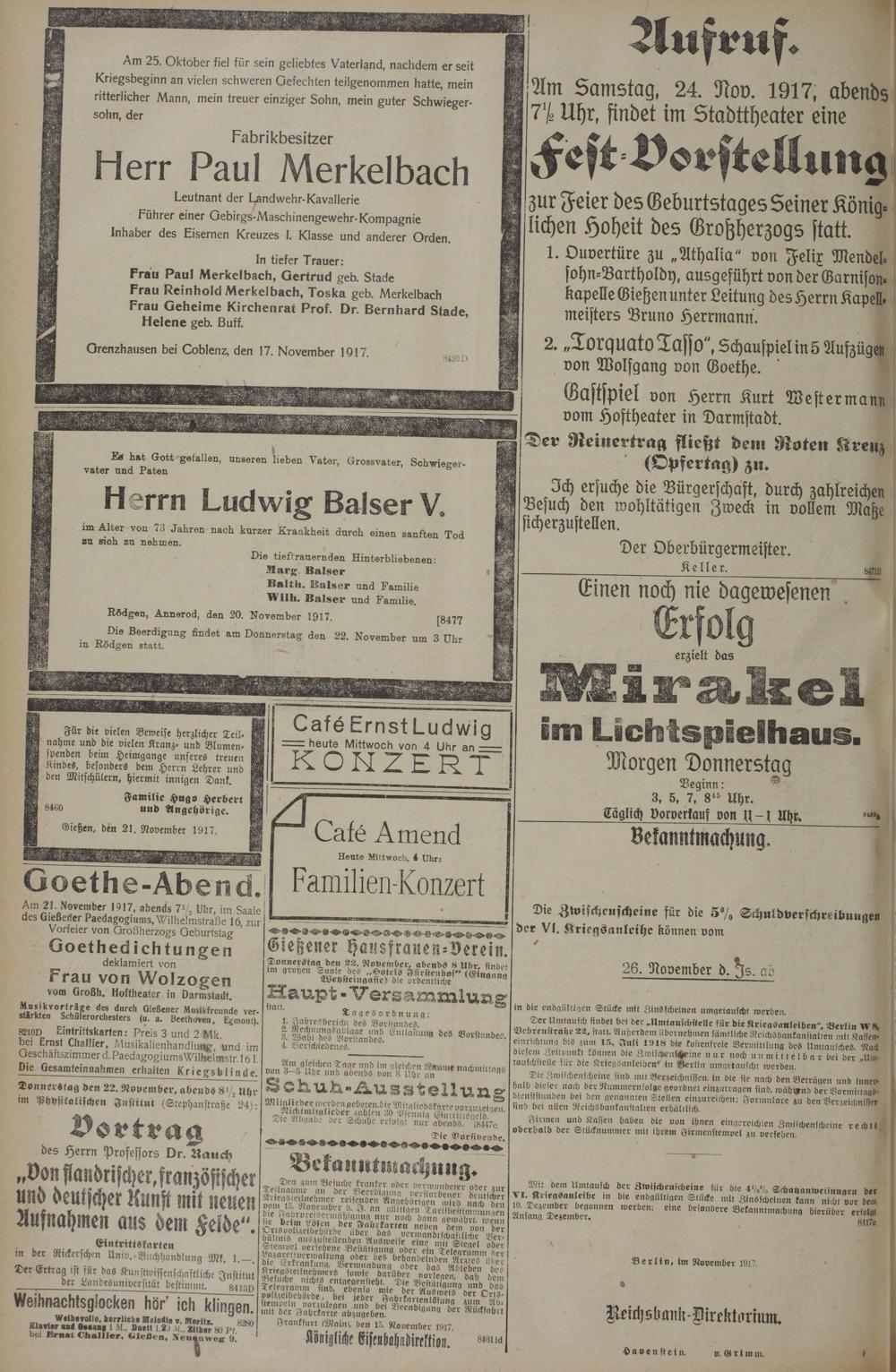 Am 21. November 1917, abends 7^ Uhr, im Saale des Gießener Paedagogiums, Wilhelmstraße 16 zur Vorfeier von Oroßherzogs Geburtstag ’