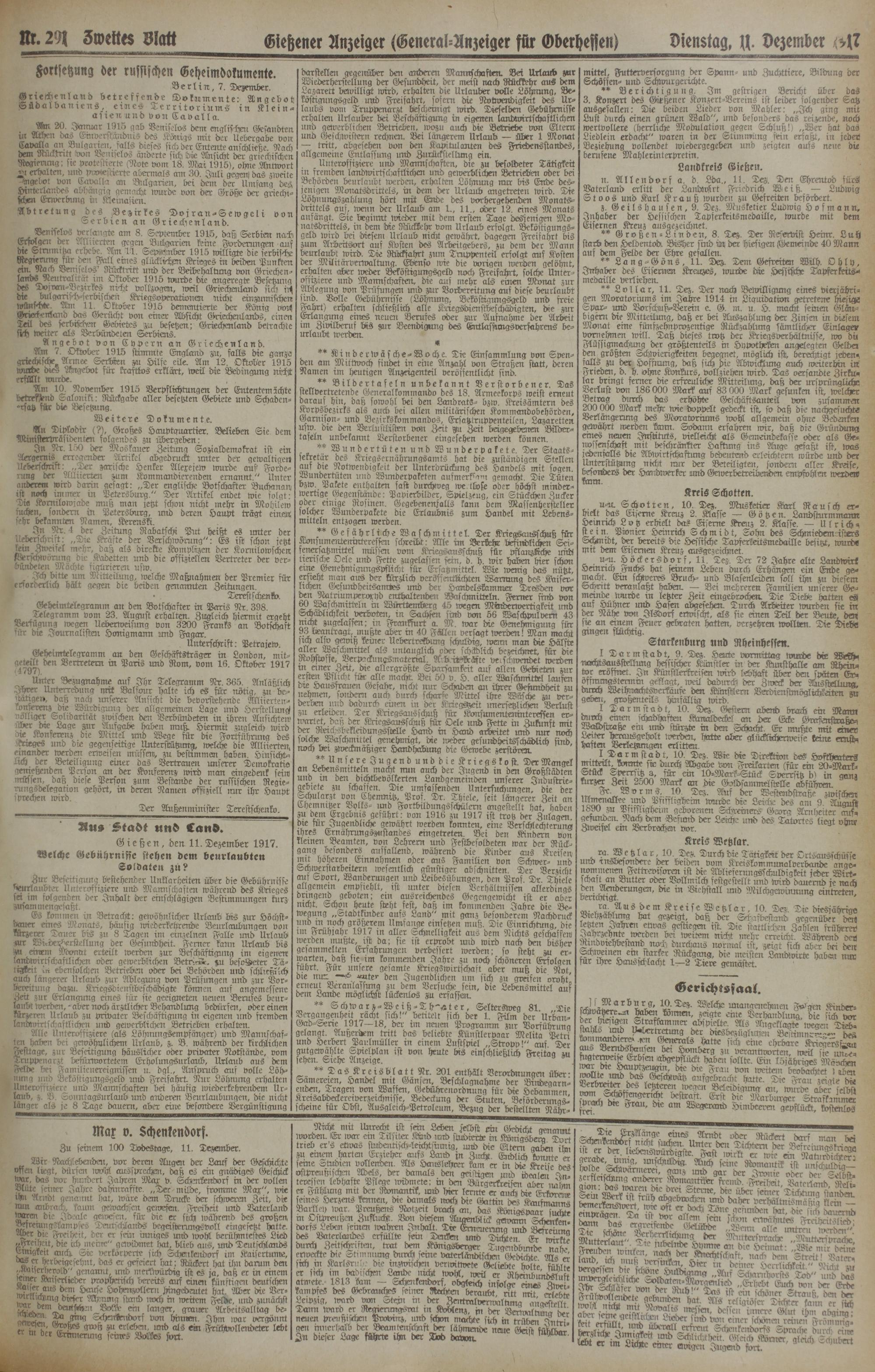 n. Allendorf a. d. Lda., 11. Dez. Den Ehrentod fiirsö Vaterland erlitt der Landwsirt Friedrich Weiß. — Ludwig Stoos und Karl Krauß wurden zu Gefreiten befördert.