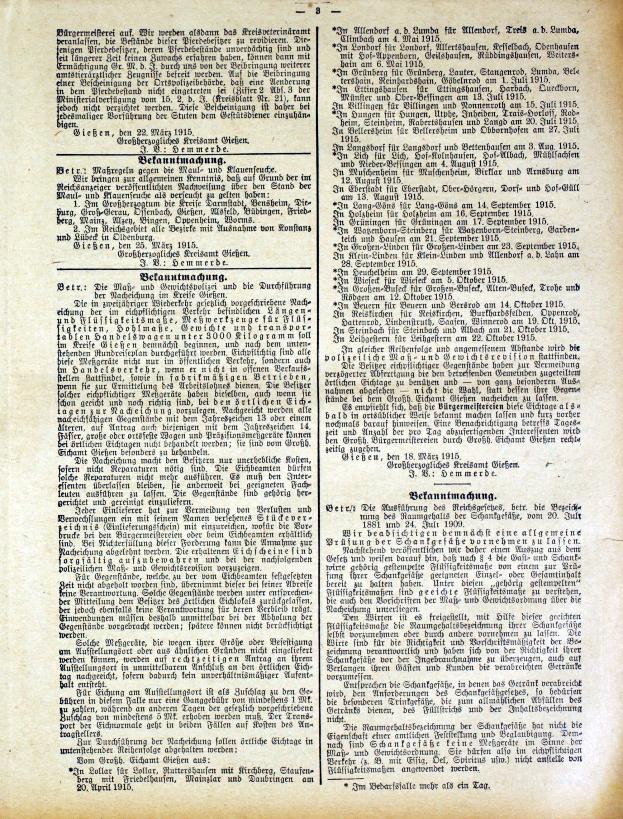 Es empfiehlt sich, daß die vürgermeiftercien diese Eichtage alsbald in ortsüblickzer Weife bekannt machen lassen nnd kurz vorher nochmals darauf Hinweisen. Eine Benachrichtigung betreffs Tageszeit und Anzahl der pro Tag abzuscrtigenden Interessenten wird den Großh. Bürgermeistereien durch Großh. Eichamt Gießen rechtzeitig zugehen.